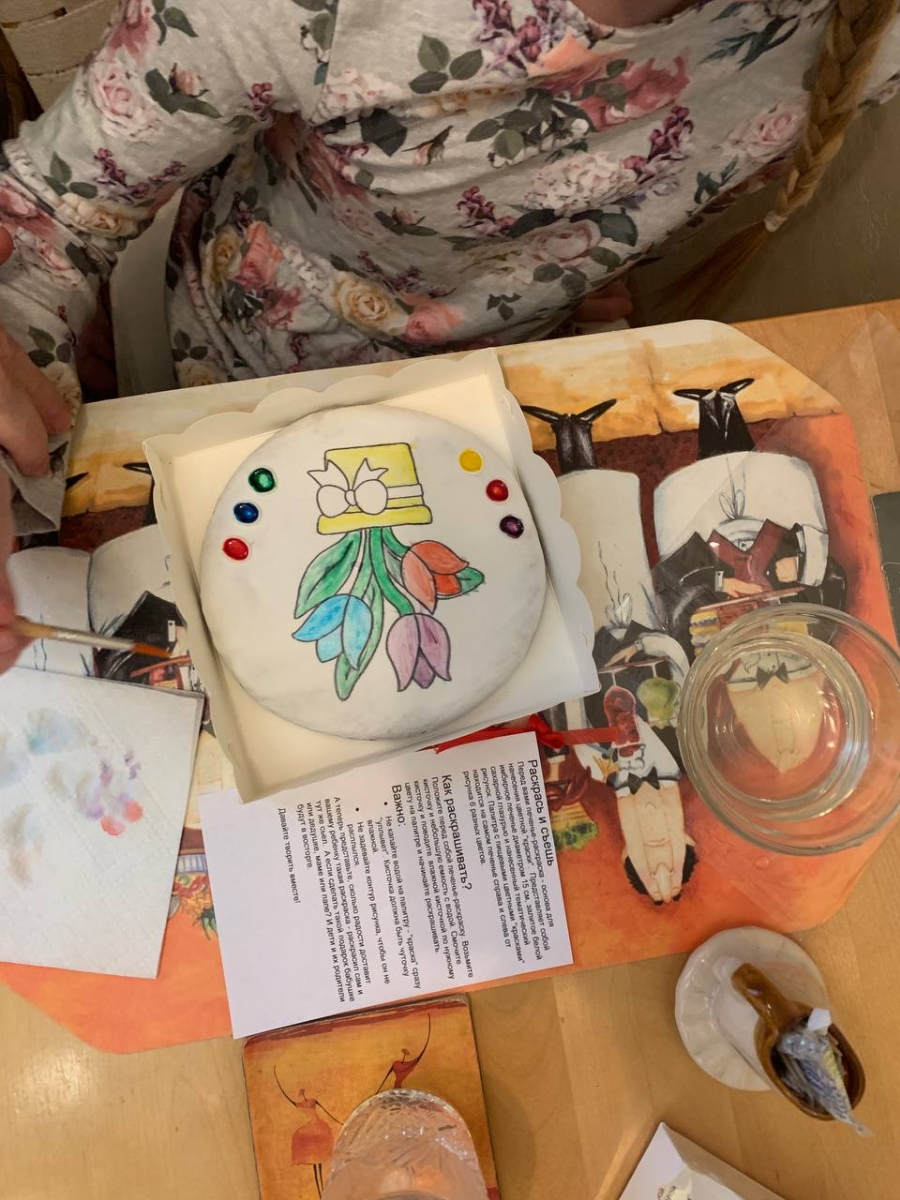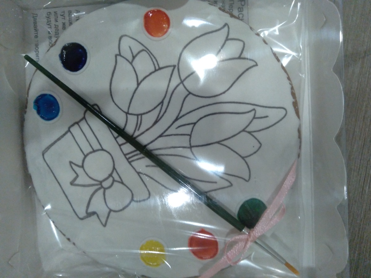 Раскрась и съешьПеред вами печенье-раскраска - основа для нанесения цветной "краски". Представляет собой имбирное печенье диаметром 15 см, залитый белой сахарной глазурью и нанесенный тематический рисунок. Палитра с пищевыми цветными "красками" находится