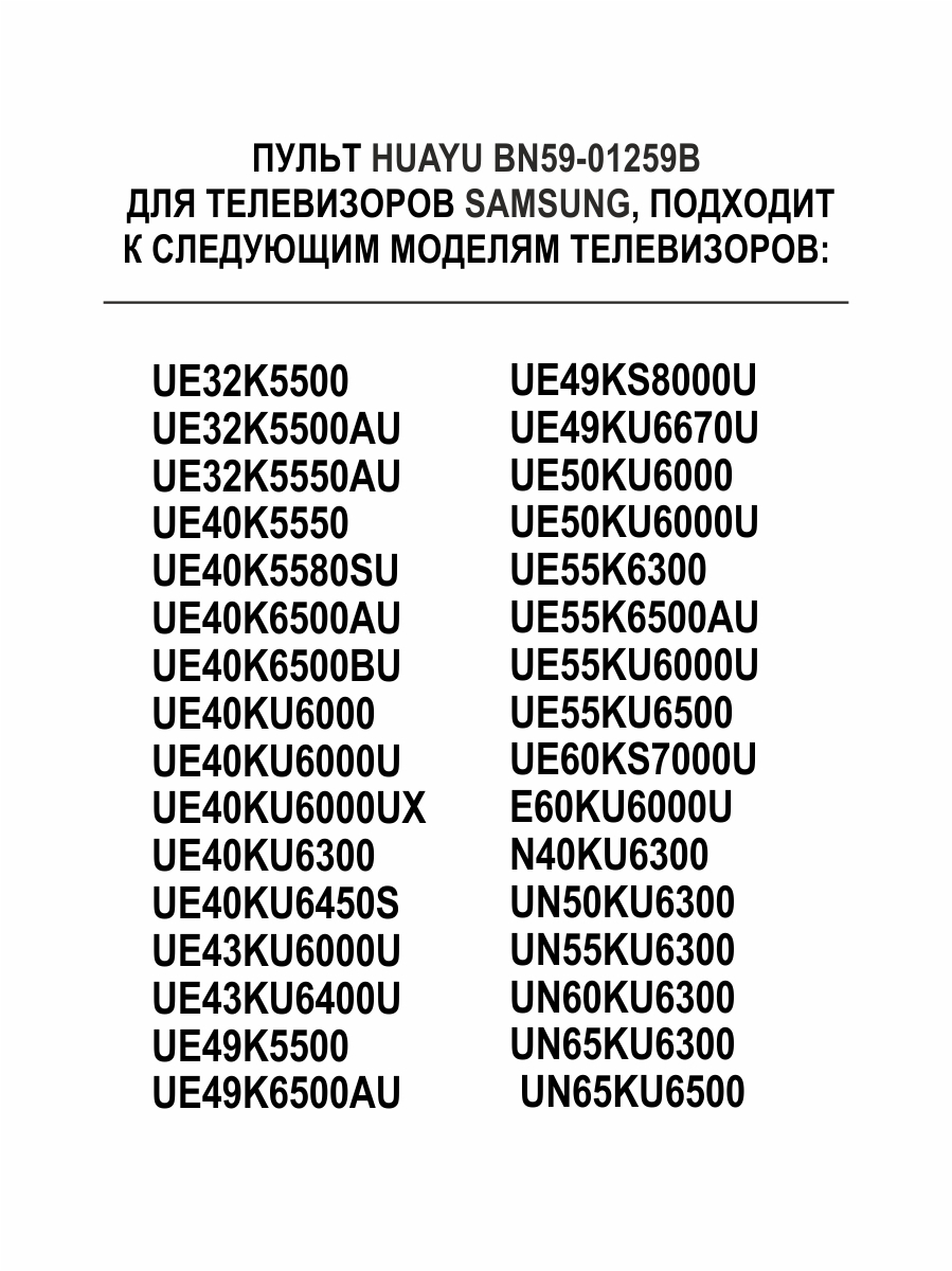 Пульт Huayu BN59-01259B для телевизоров Samsung. Питание от батареек типа ААА, необходимо 2 шт. Пульт Huayu BN59-01259B совместим со следующими телевизорами Samsung: UE-32K5500, UE-32K5500A, UE-32K5550A, UE-40K5500, UE-40K5500A, UE-40K5500AU, UE-40K5500B,
