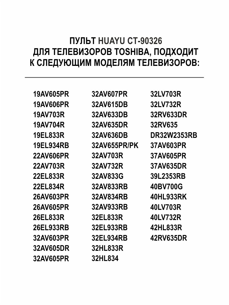 Пульт Huayu CT-90326 для телевизоров Toshiba. Данный ПДУ не требует настройки, достаточно вставить батарейки типа ААА (мизинчиковые) и пульт СТ-90326 можно использовать по прямому назначению. Список поддерживаемого оборудования: 32CS460, 32LA644V, 32LM62
