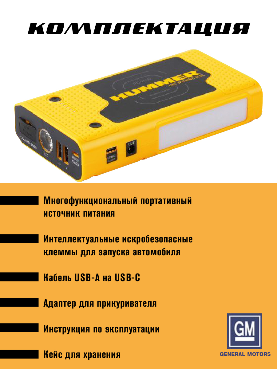 Комплектация:★ Многофункциональный портативный источник питания★ Интеллектуальные искробезопасные клеммы для запуска автомобиля★ Кабель USB-A на USB-C★ Переходник прикуривателя★ Инструкция по эксплуатации★ Чехол для храненияОписание:Портативное пусковое у