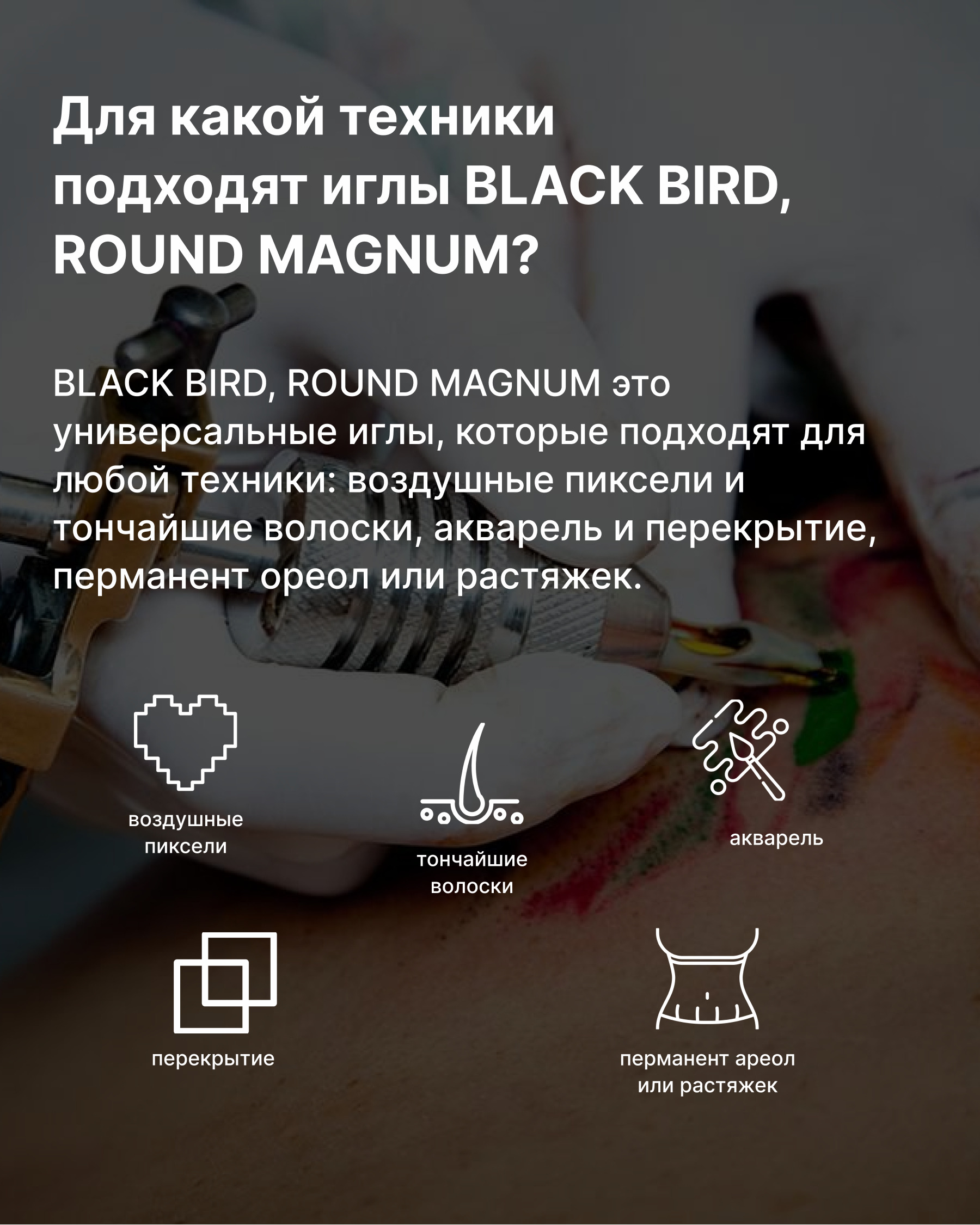 Иглы для тату Round Magnum 5 Пайка 5 игл напаяны специальным способом полукругом для меньшего травматизма кожи; дает равномерность закраса, мягкость растушевки и плавность переходов. Высококачественные, в блистерной упаковке. Иглы тату RM 5 подходят для п