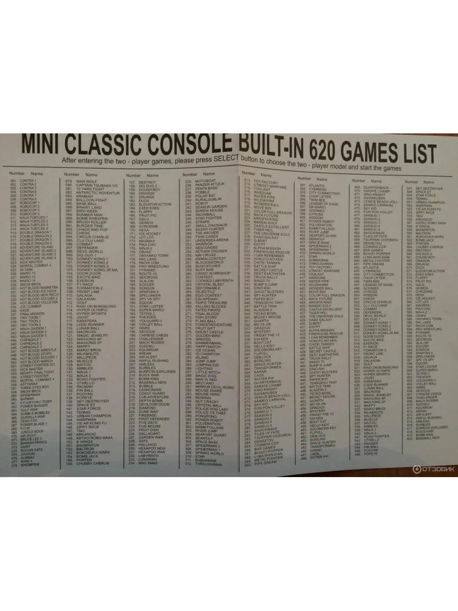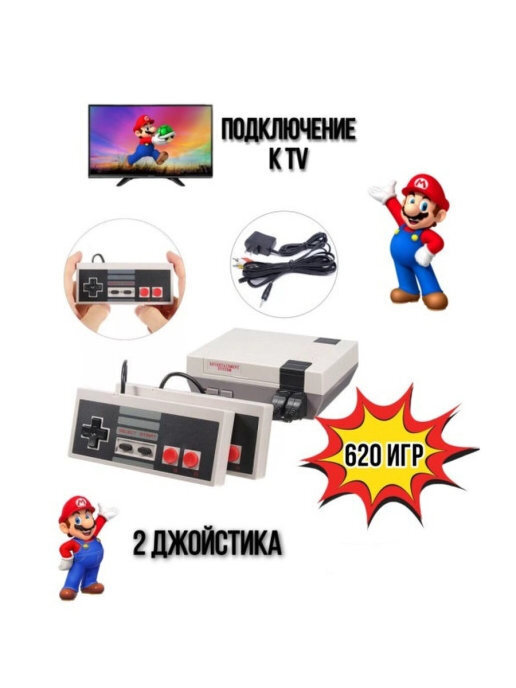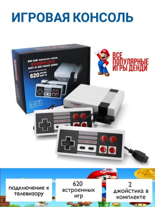 Ретро приставка 620 игрПредставляем игровую приставку в виде Денди, объединяющую в себе лучшие игры - хиты 90-х.В приставку можно играть на любом телевизоре и вдвоём.Это всем известные игры: Mario, Contra, Teenage Mutant Ninja Turtles, Double Dragon, Mega