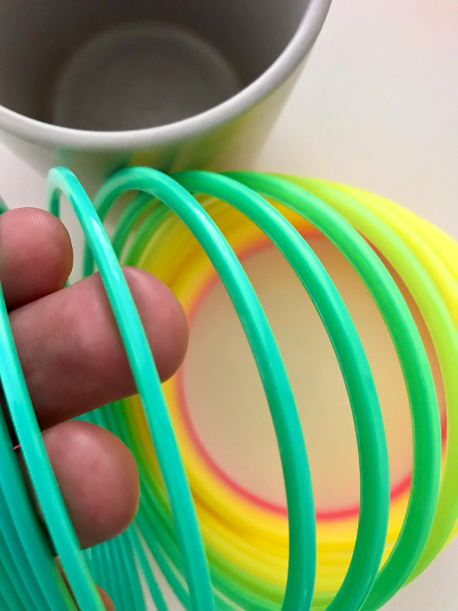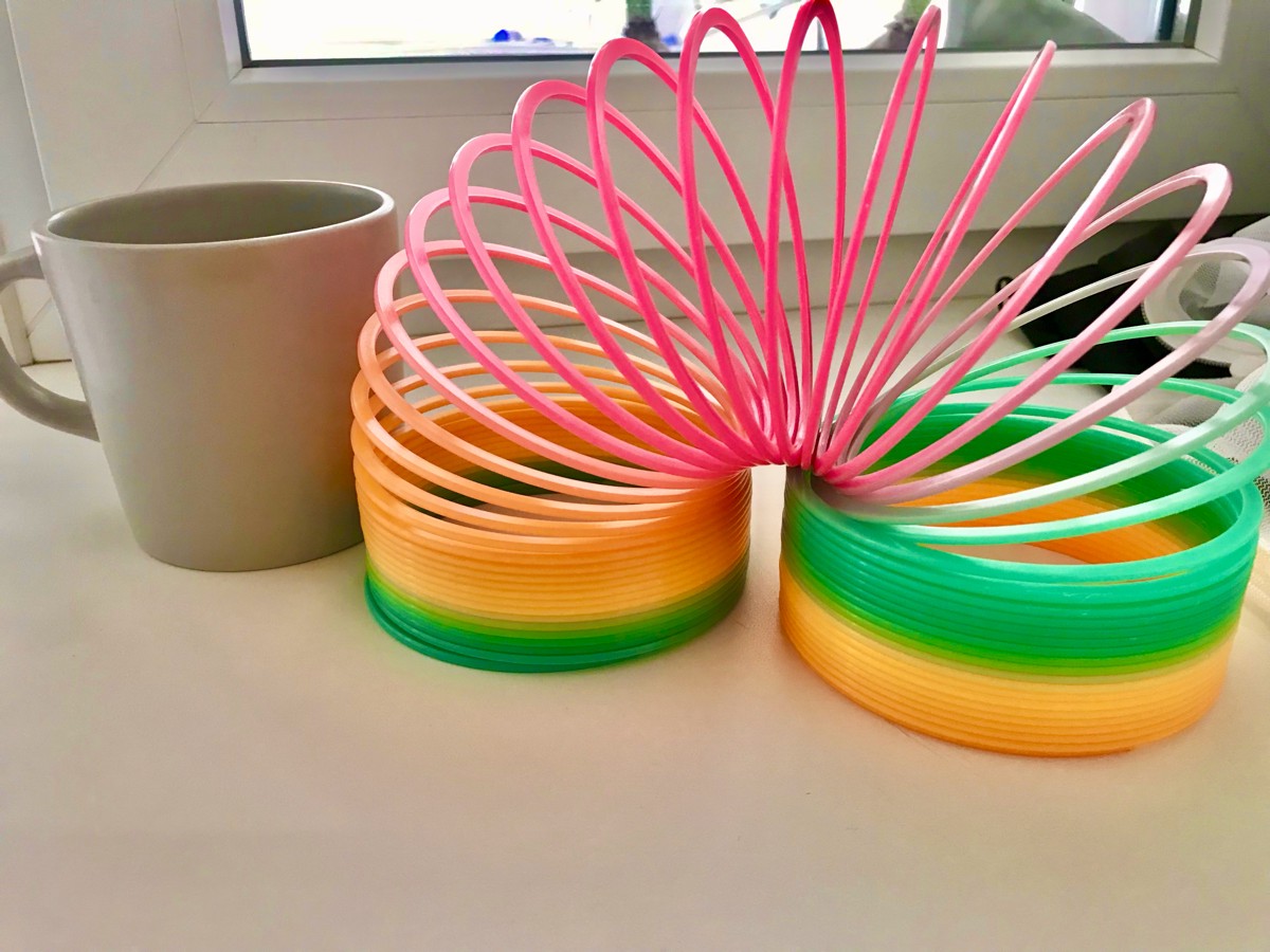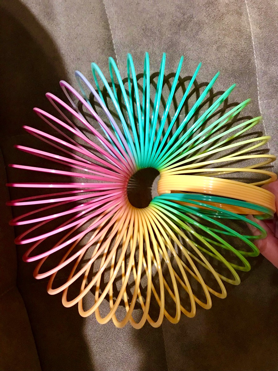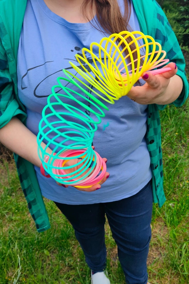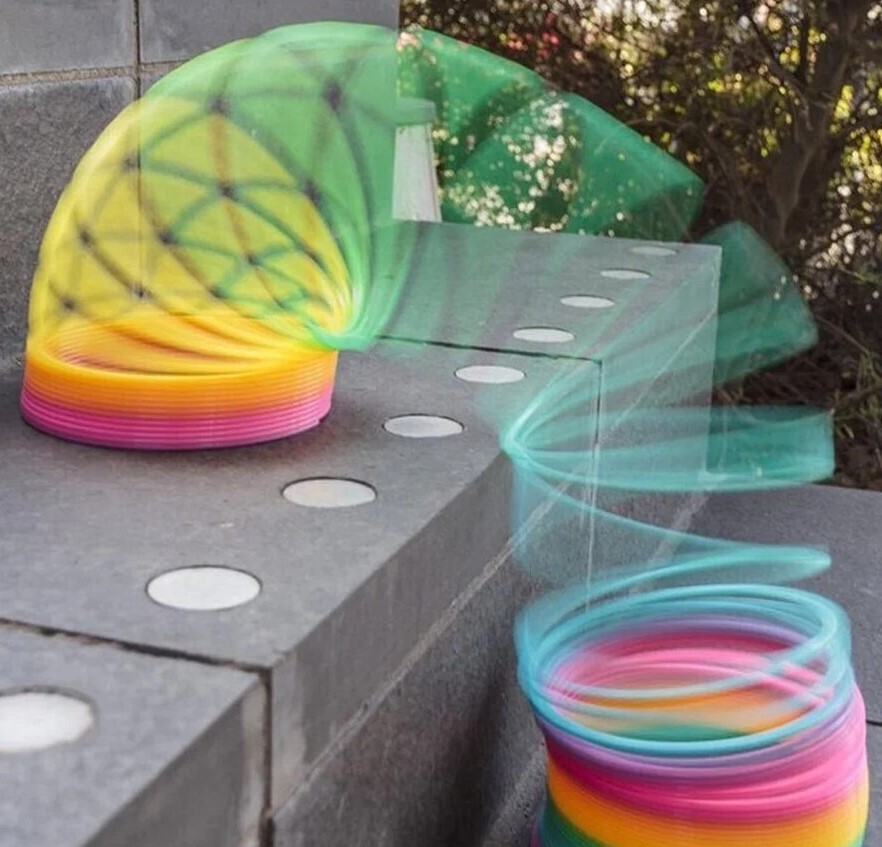 Помните игрушки 90-х: тетрис, йо-йо, фишки, киндеры, лизун, лазер, тамагочи, сега и денди? Радуга-пружинка, она же известная Слинки, является одной из легендарных игрушек и пользуется популярностью более 70 лет. Спираль развивает у детей реакцию, координа