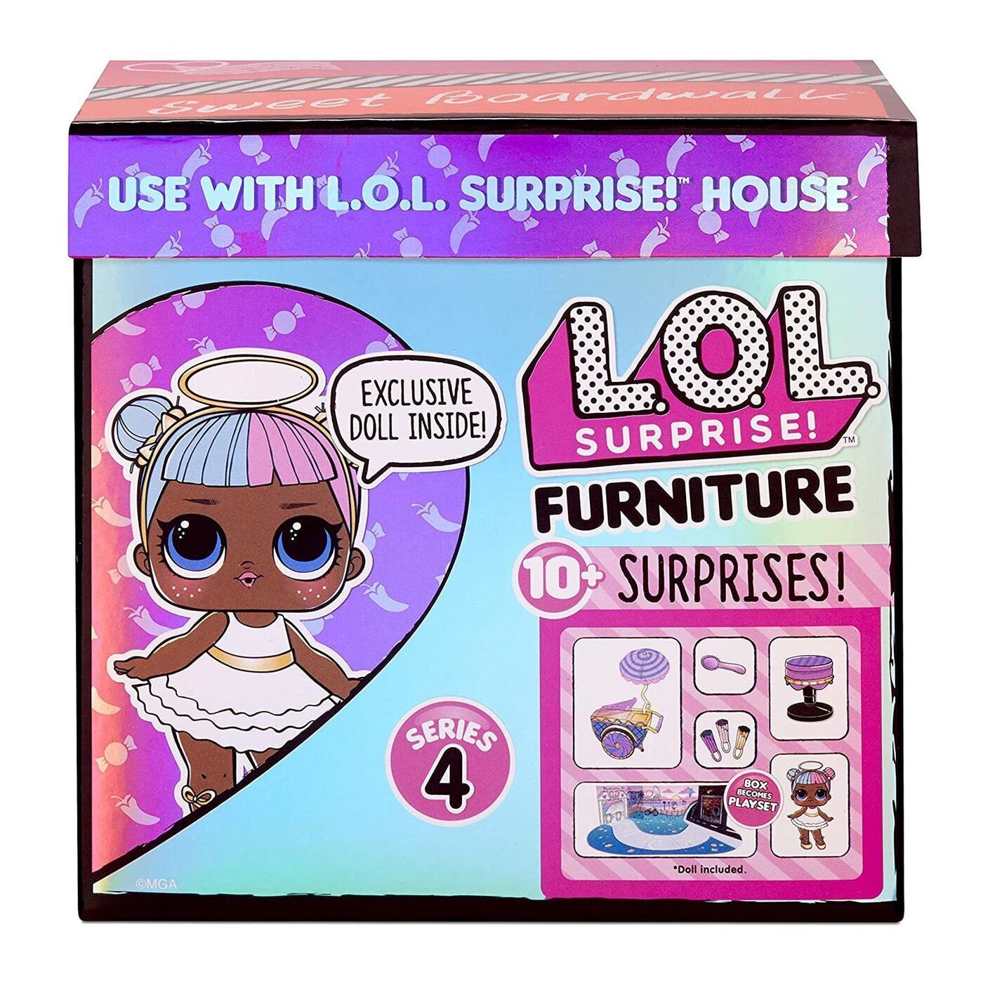 LOL Игровой набор Sweet Boardwalk серия 4 c куколкой Sugar из 2 серии, тележкой со сладостями под зонтиком и аксессуарами, которые можно расположить на импровизированной игровой зоне – набережная с морем. Игровая зона раскладывается из упаковки, внутри фо