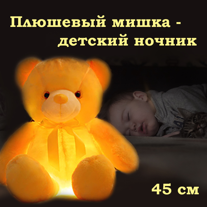 Дополнительная информациянажав на правую лапку, малыш услышит успокаивающую колыбельную; при нажатии на левую лапку на щёчках и лапках начнут мигать разноцветные огоньки; если нажать на животик игрушки, то включится светильник; все режимы могут работать одновременно