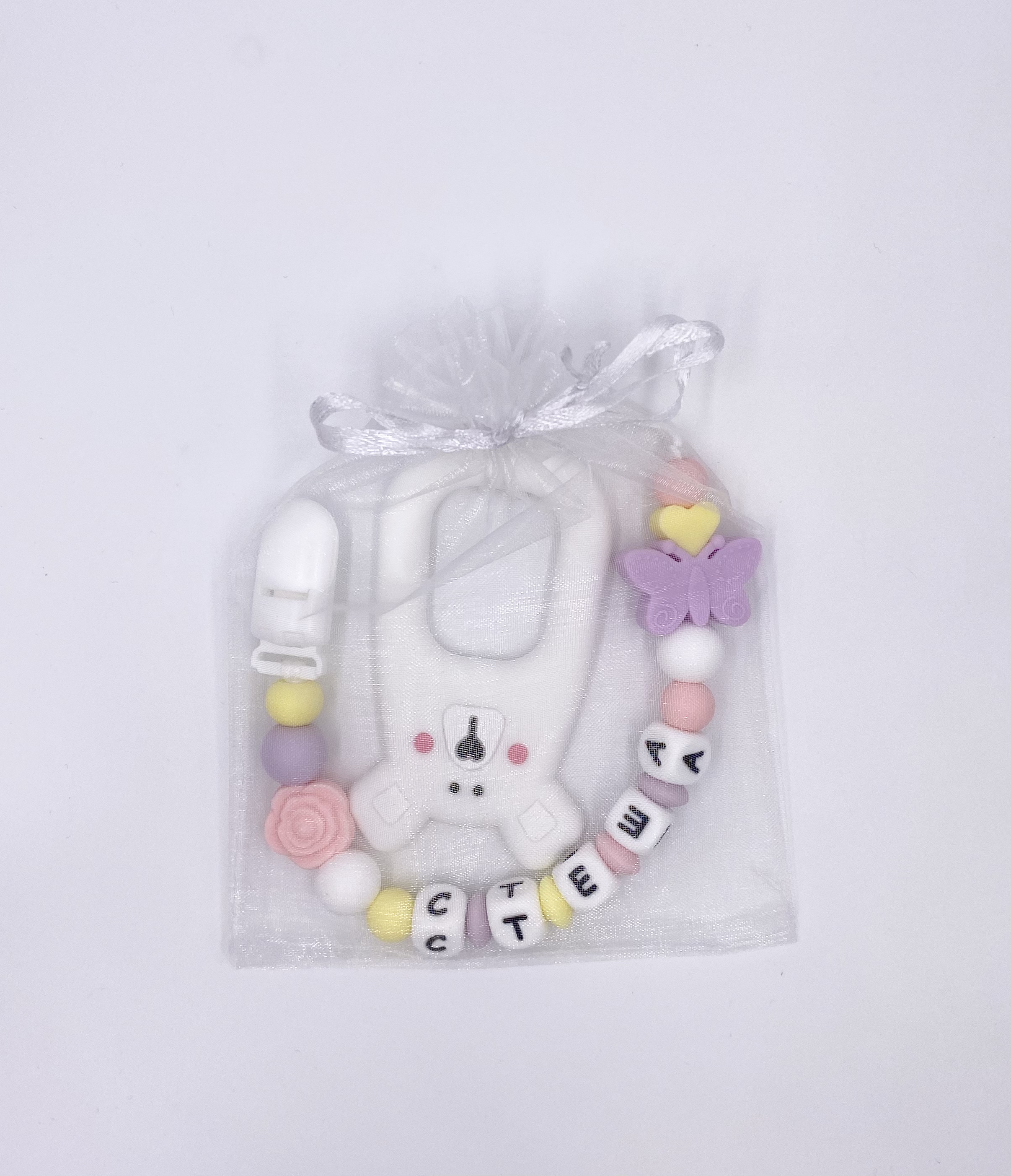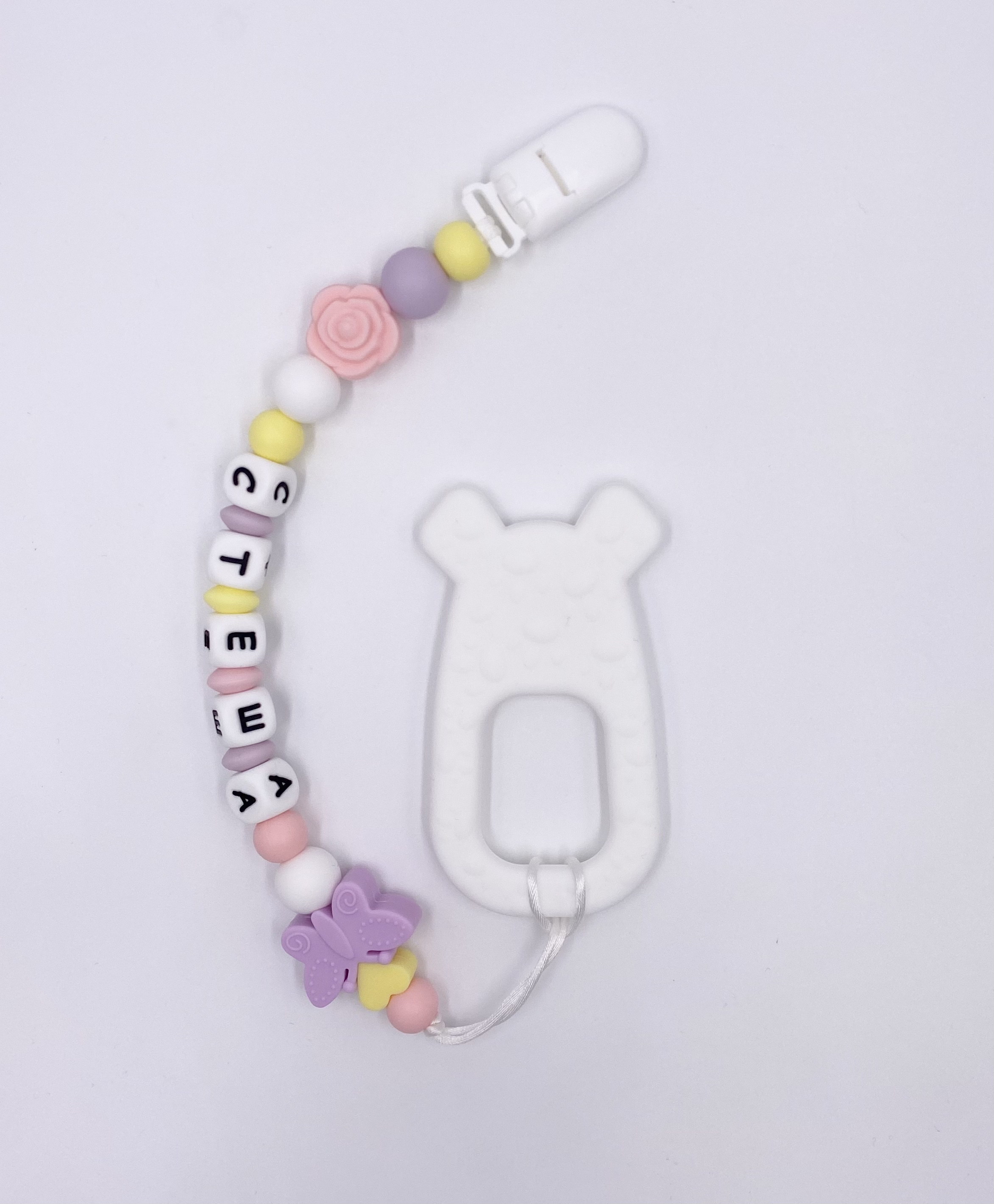 Комплектация:Именной держатель для пустышки, прорезывательОписание:Держатель для пустышки с прорезывателем будет отличным помощником в непростой период для малыша и мамы! А также останется памятной вещью на долгие годы!Пищевой силикон нежный и приятный на
