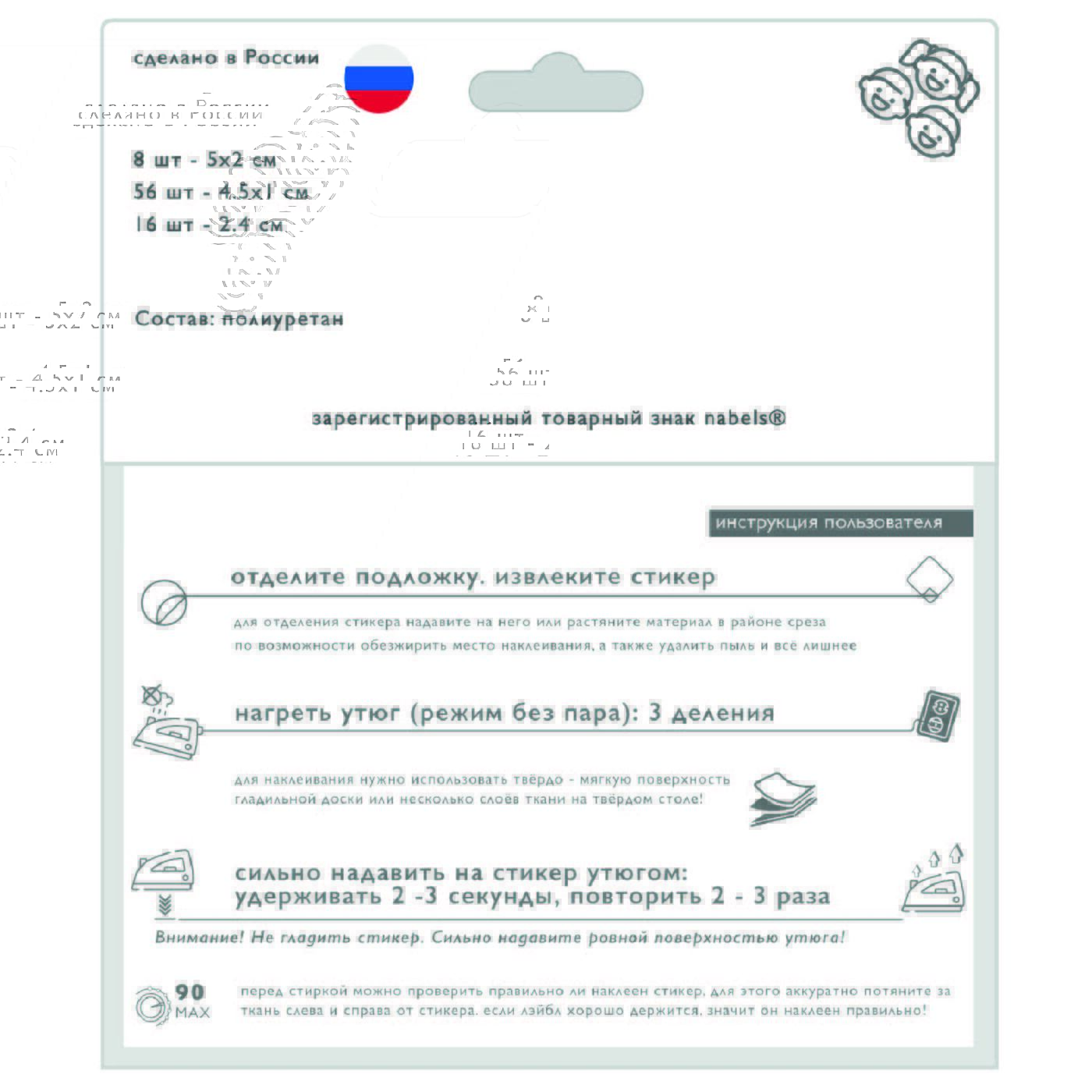 Комплектация:инструкция; калька; перманентный маркер - 1 шт.; наклейки для одежды в детский сад или школу 80 шт.Описание:Стикеры Nabels мягко наклеиваются на любой тип ткани (утюг в режиме «хлопок»: три деления) - использовать кальку при необходимости. Чр