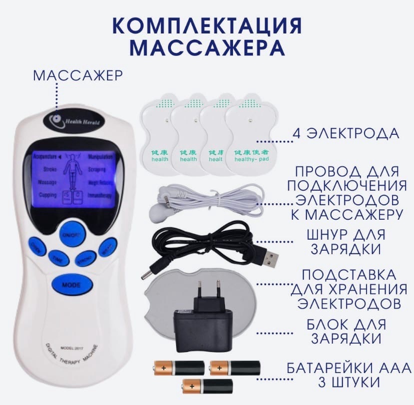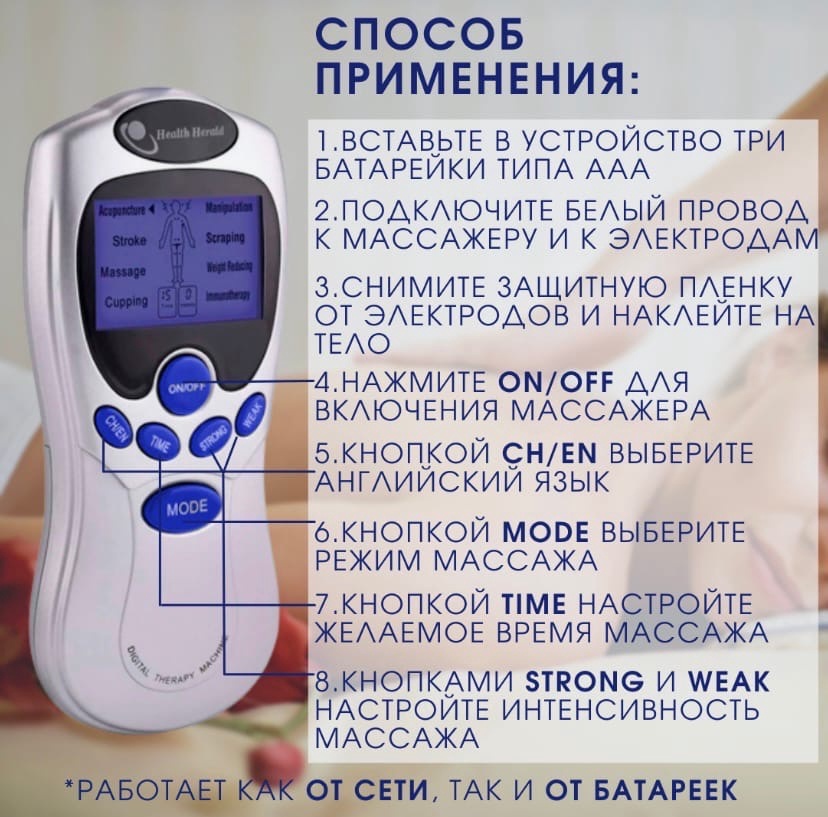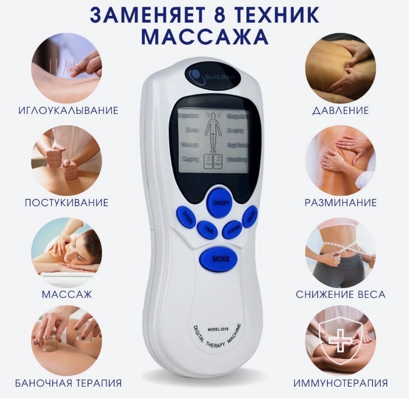 Массажер миостимулятор - Цифровой Меридиан безопасный и надежный прибор, легкий, портативный, который удобно носить с собой. Электронные импульсы стимулируют акупунктурные точки давления и улучшают кровоток, массажер снимает боли в спине, плечах, мышечные