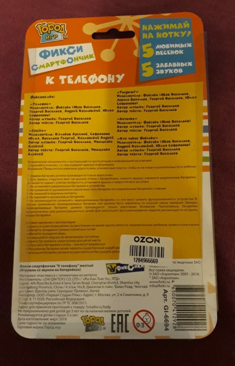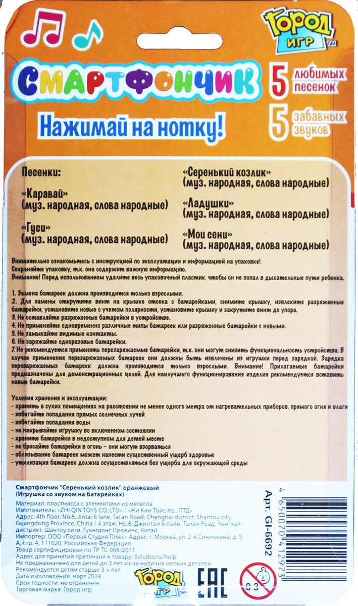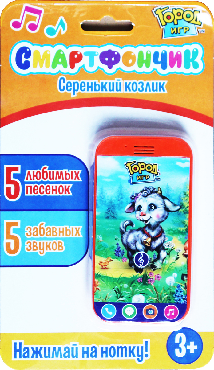 Новый компактный детский смартфончик "Серенький козлик" с популярными народными песенками. Теперь любимые персонажи всегда рядом и порадуют малыша знакомыми песенками ("Каравай", "Гуси", "Серенький козлик", "Ладушки", "Мои Сени") и весёлыми звуками. Всё у