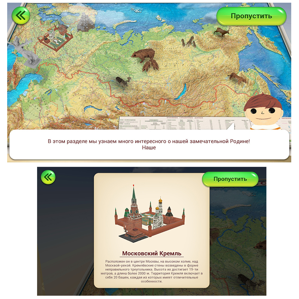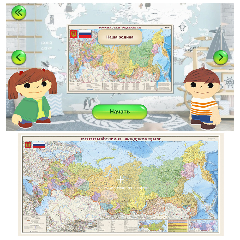 Интерактивная политико-административная карта Российской Федерации. Раздел в приложении: "Наша Родина". Мы предлагаем Вам отправиться в увлекательное путешествие по нашей Родине с известными персонажами Сашей и Машей. Наши герои будут сопровождать Вас на