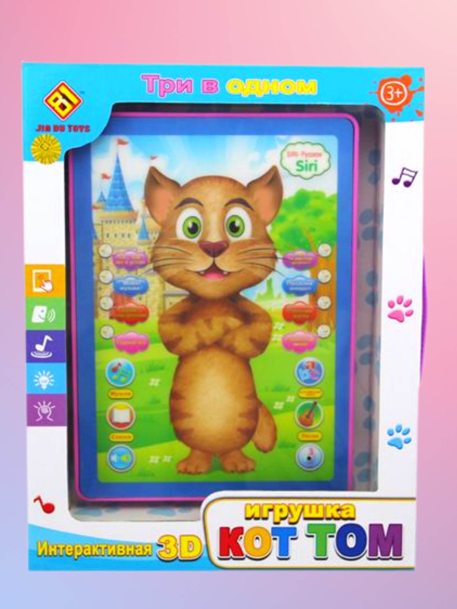 Детский интерактивный планшет "Кот Том" отвечает на ваши вопросы. Попросите его включить музыку, и он будет петь песни. Попросите рассказать анекдот и вы услышите много новых смешных анекдотов, он будет шутить и смеяться вместе с вами, повторять звуки и с