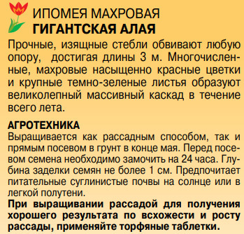 Комплектация:Количество семян в упаковке 5 штукОписание:ИПОМЕЯ МАХРОВАЯ ГИГАНТСКАЯ АЛАЯПрочные, изящные стебли обвивают любую опору, достигая длины 3 м. Многочисленные, махровые насыщенно красные цветки и крупные темно-зеленые листья образуют великолепный
