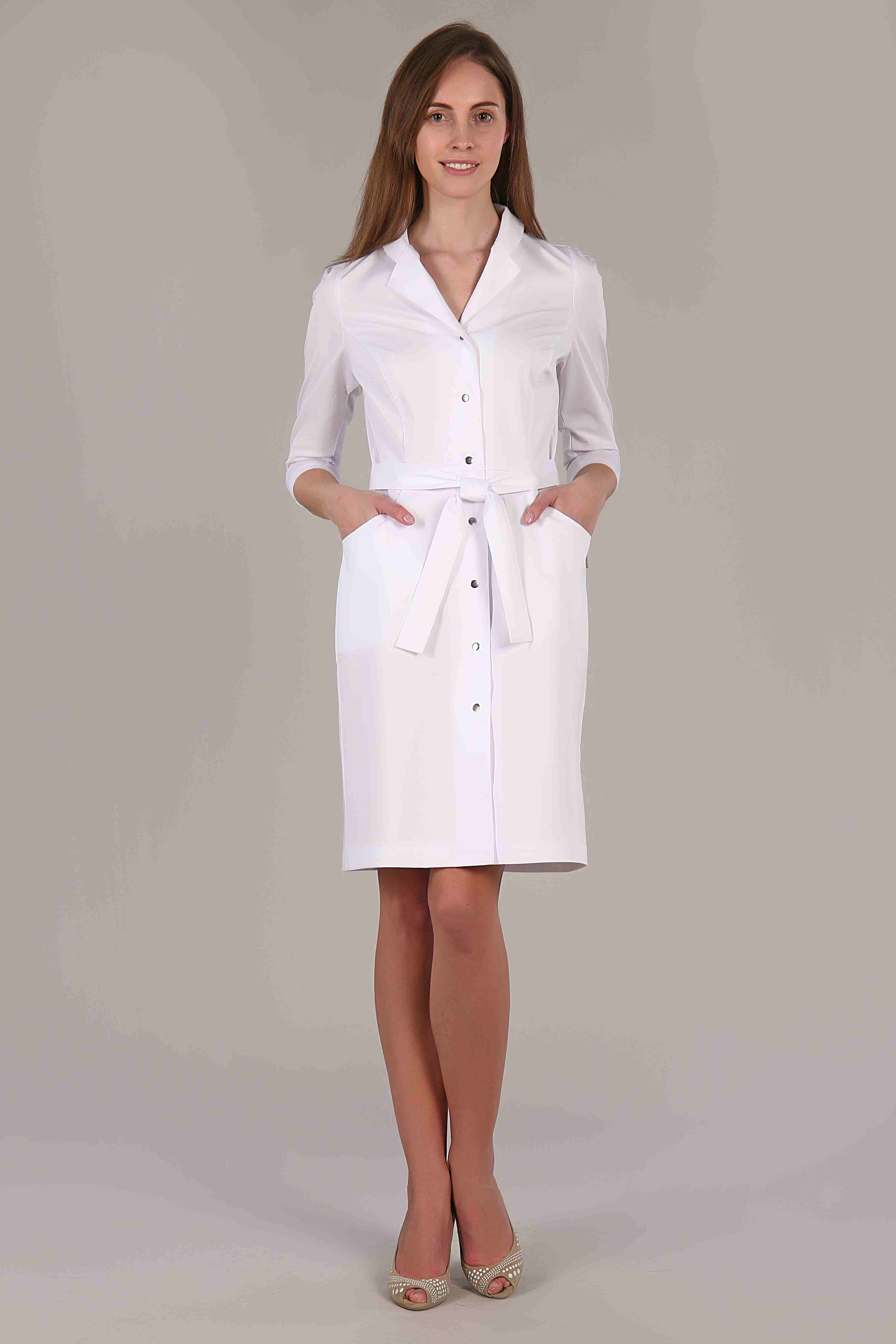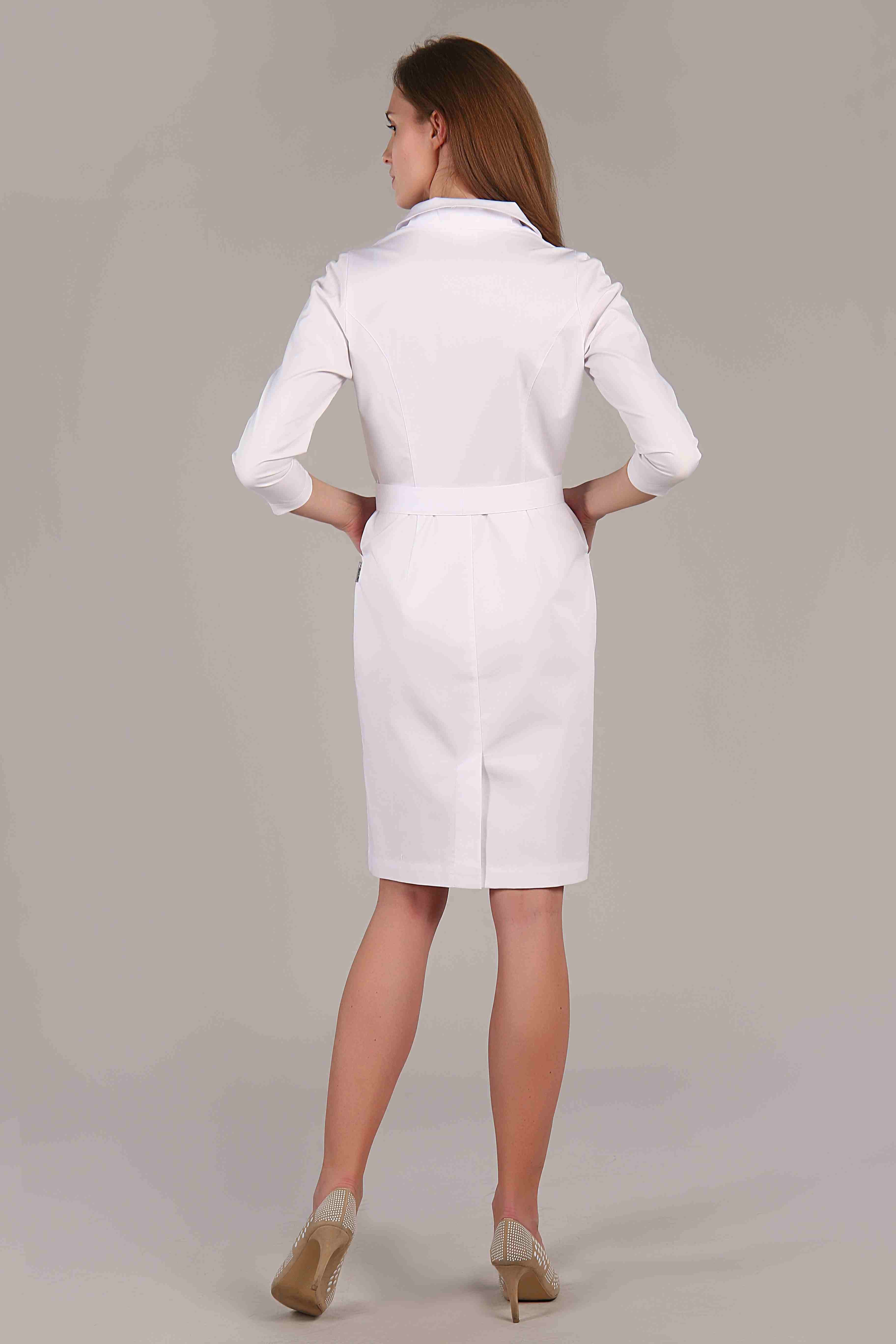 Женский медицинский халат прилегающего силуэта. Застежка центральная на кнопки. Элегантность модели придают рельефы, отложной воротник и рукав три четверти. Сзади шлица. Медицинский халат женский. Медицинская одежда для женщин. Медицинская форма. Униформа
