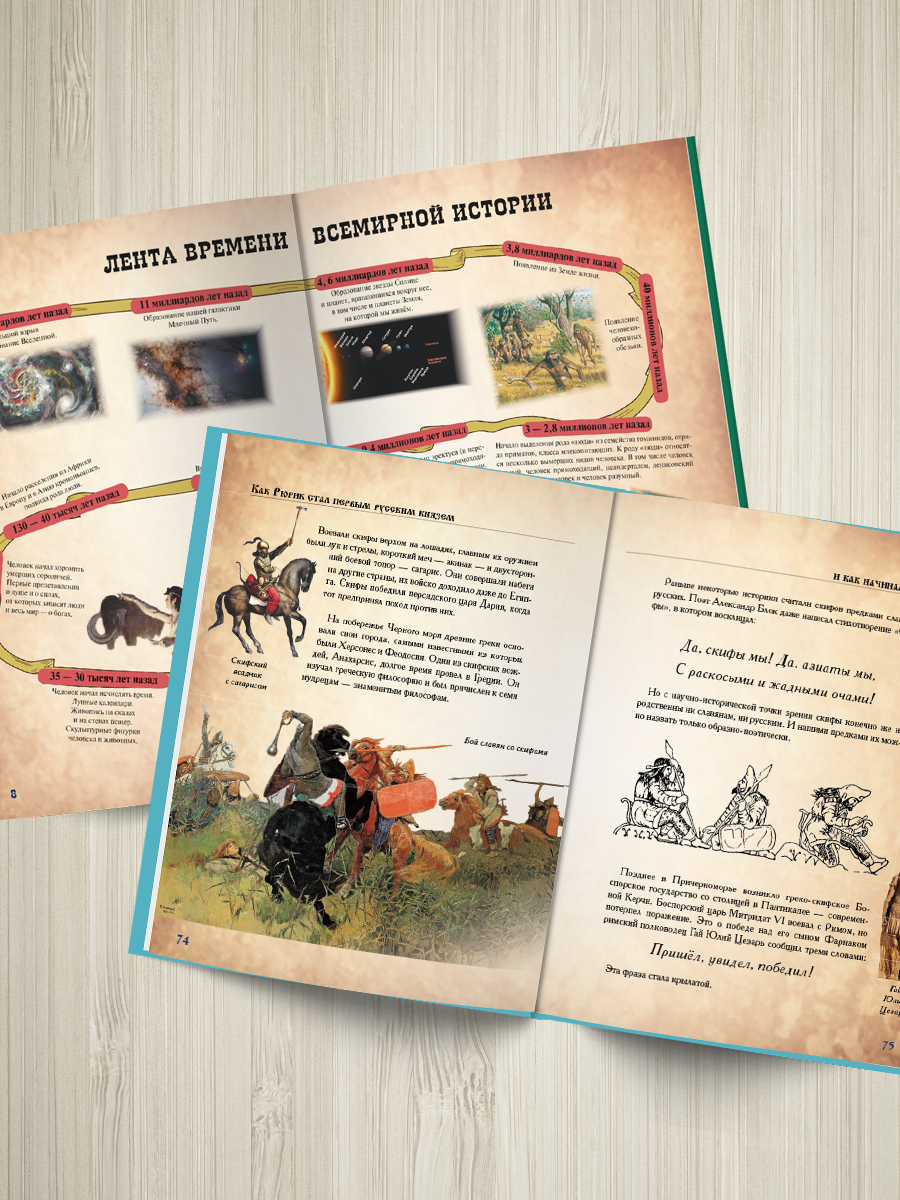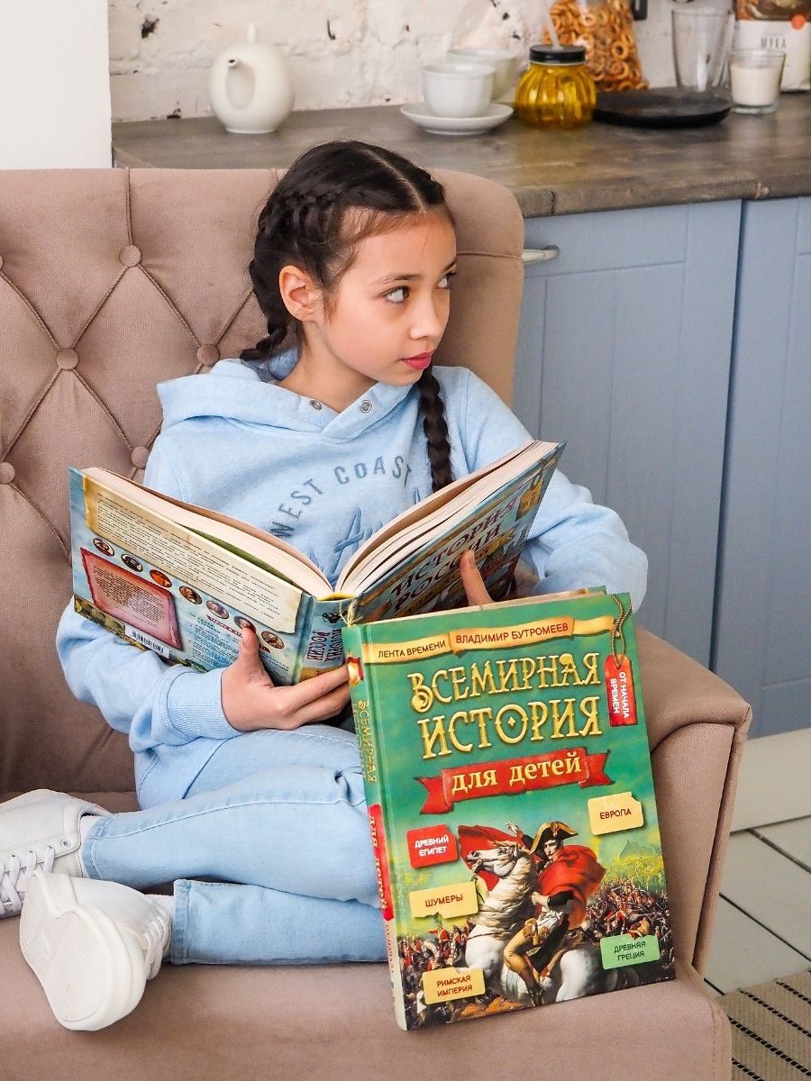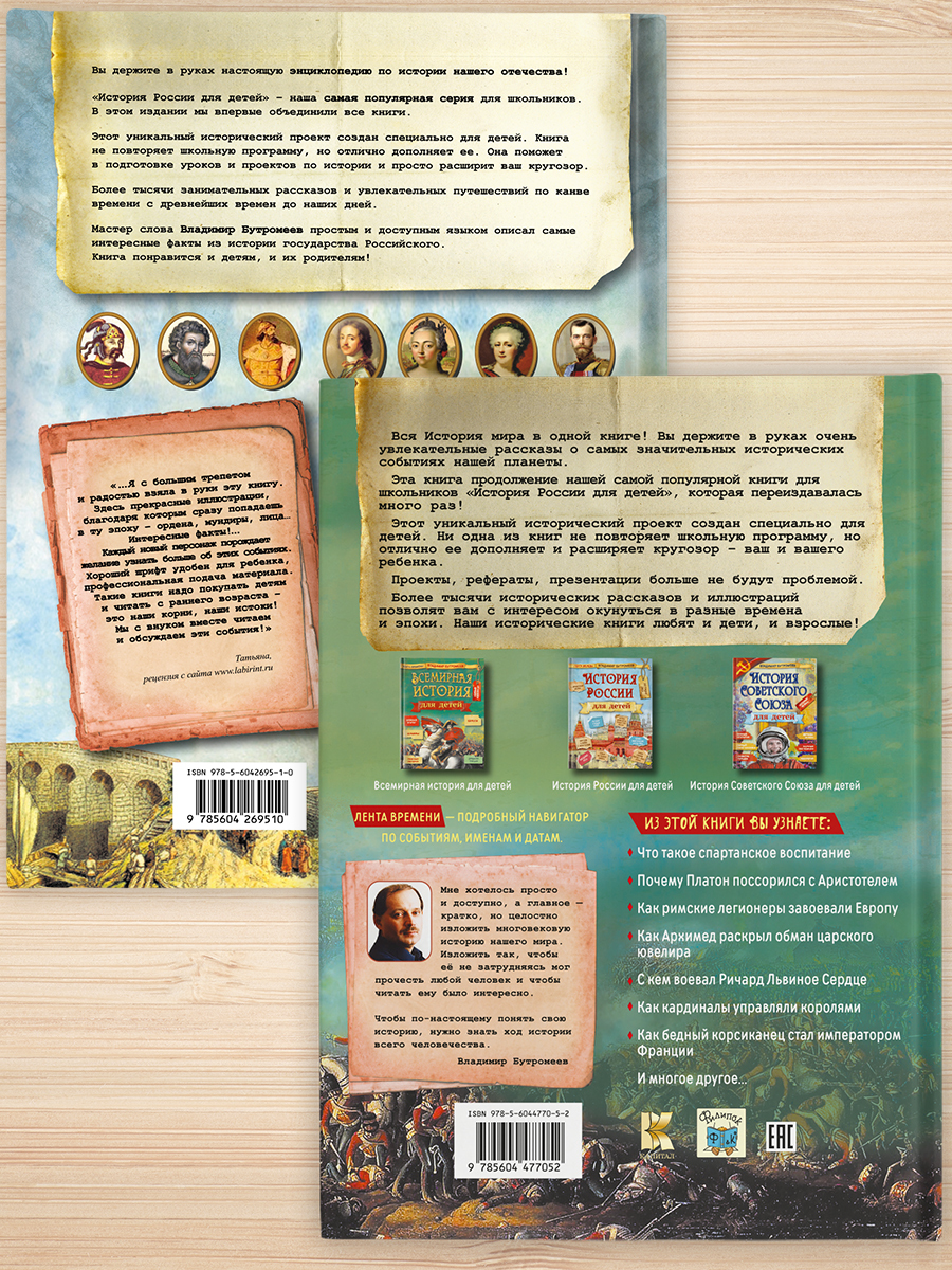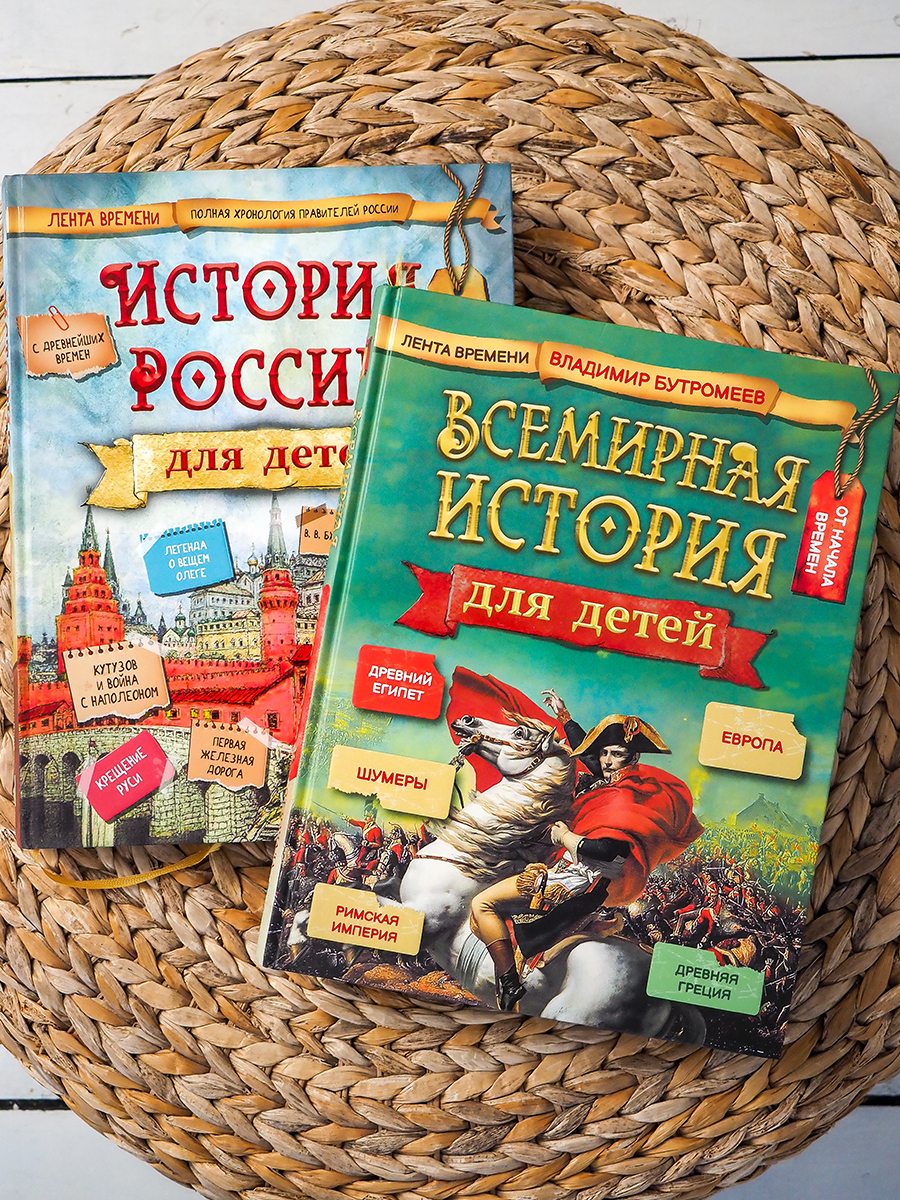 Перед Вами комплект из двух книг: "История России для детей" и "Всемирная История для детей". Это уникальные экземпляры с яркой фактурной обложкой, плотной тонированной бумагой, огромным количеством иллюстраций и отличным качеством печати - такие книги ст