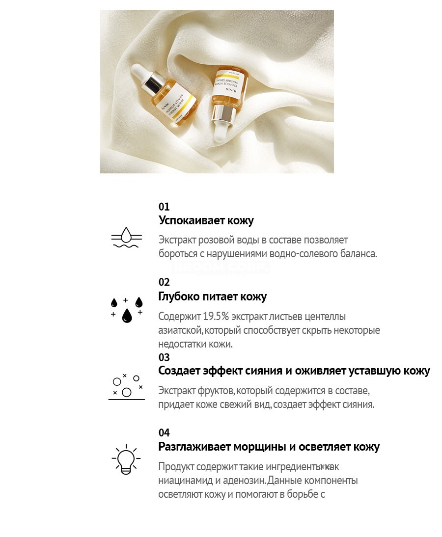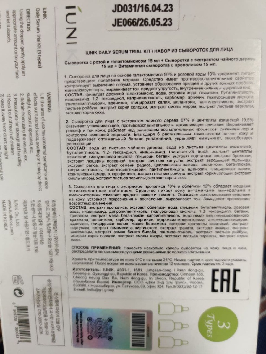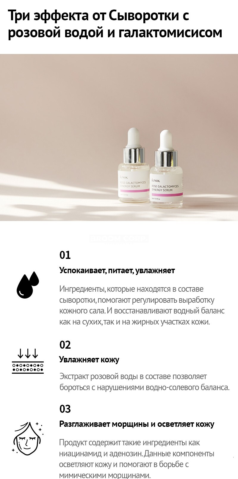 Состав:СЫВОРОТКА С РОЗОЙ: Water/Aqua, Galactomyces Ferment Filtrate, Rosa Centifolia Flower Water, Butylene Glycol, Glycerin, Propylene Glycol, Niacinamide, Sodium Hyaluronate, Adenosine, Allantoin, Illicum Verum (Anise) Fruit Extract, Scutellaria Baicale