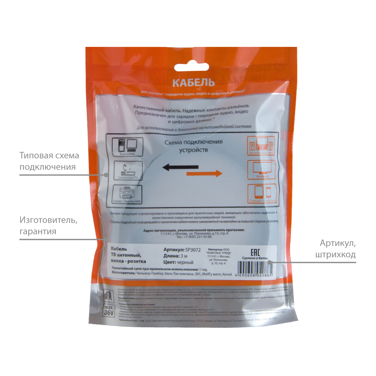 Комплектация:Кабель антенный Belsis ТВ вилка ТВ розетка, антенный, длина 3 м., чёрный, SP3072