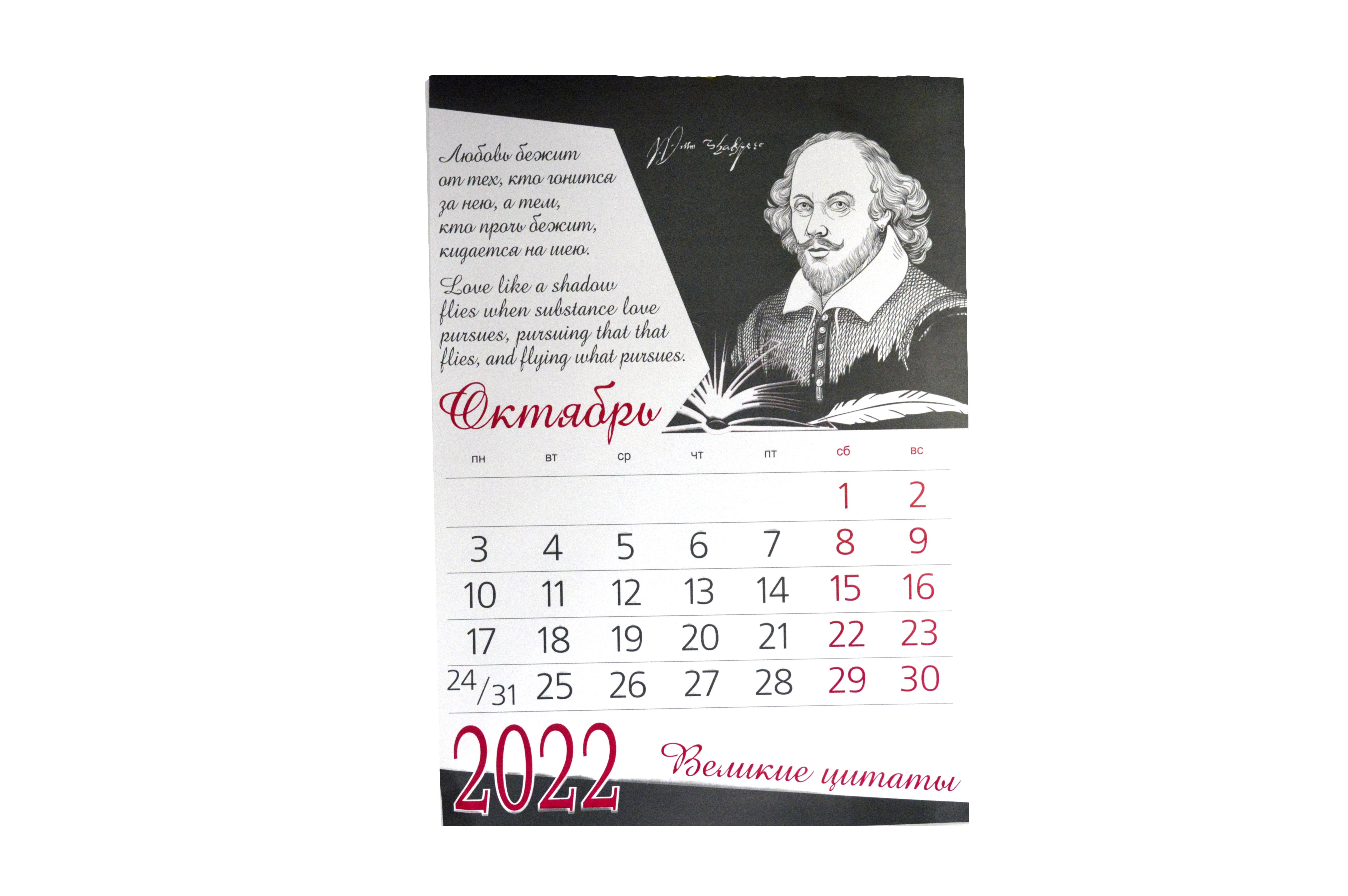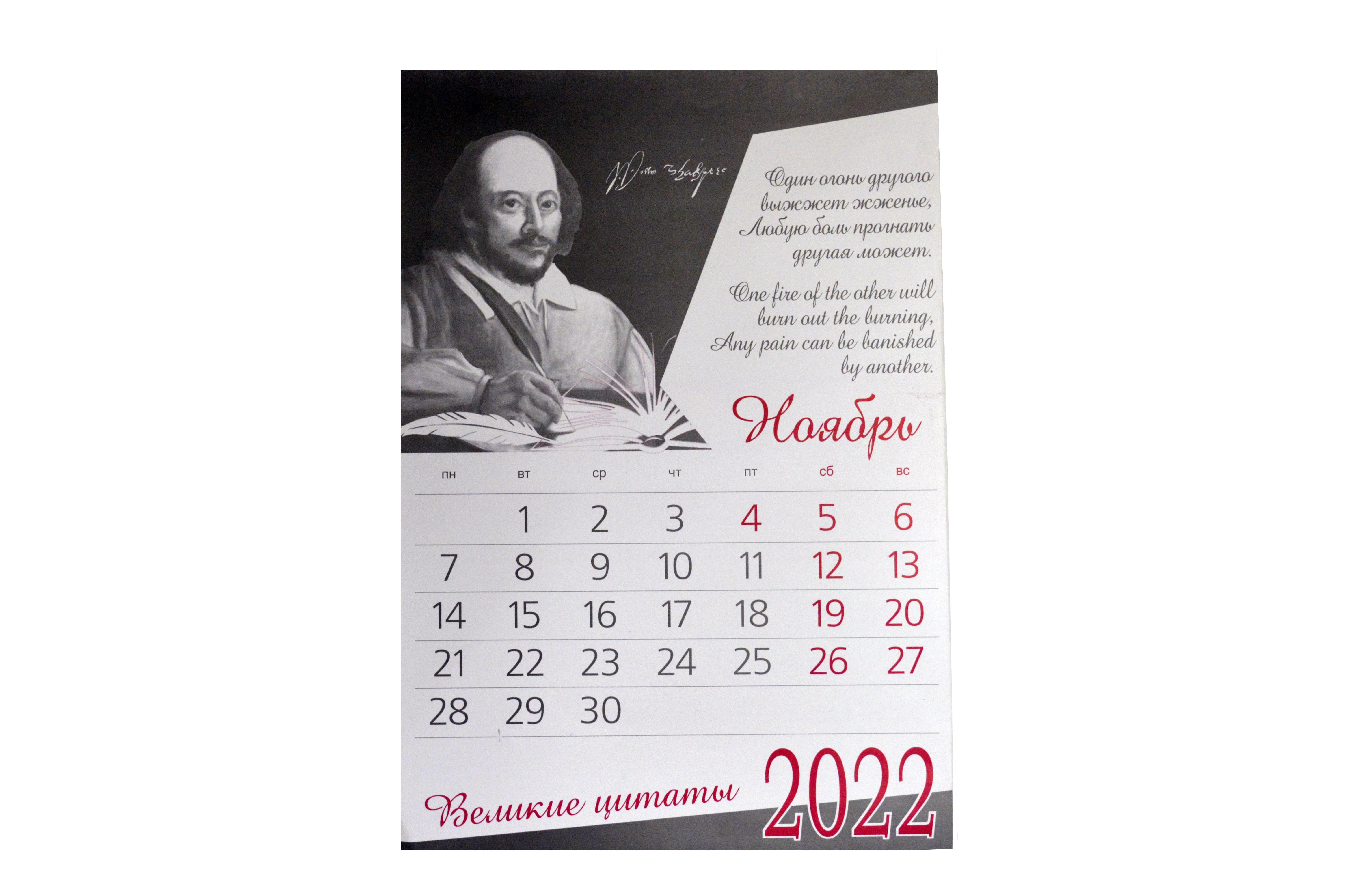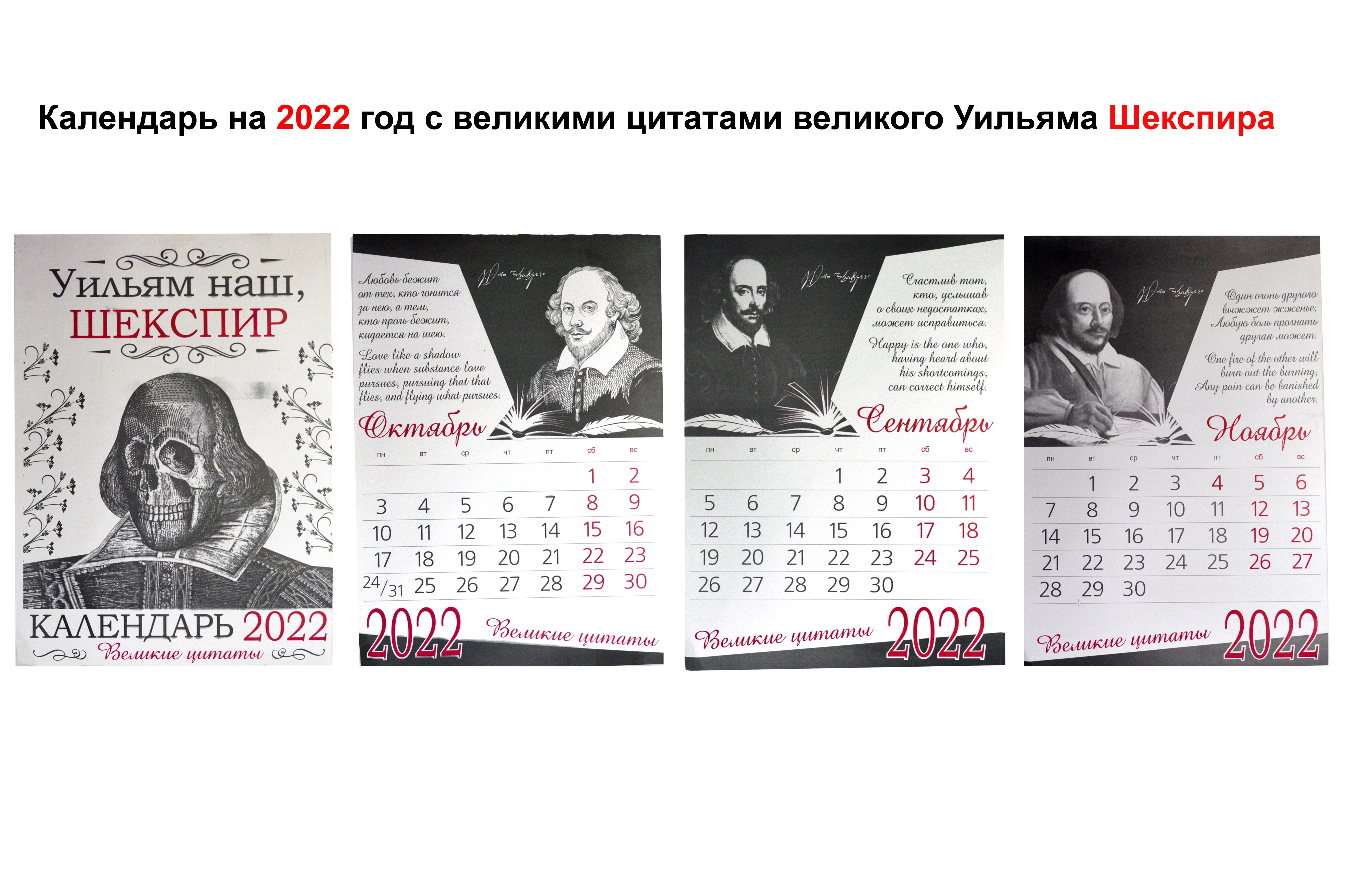 Календарь на 2022 год с великими цитатами великого Уильяма Шекспира. Каждый месяц – новое изречение английского драматурга – отличный повод вспомнить творчество классика, перечитать его шедевры, как в оригинале, так и на русском языке. По инициативе Уиль