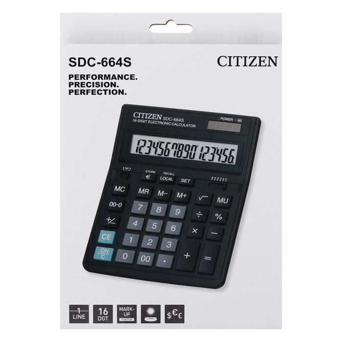Настольный калькулятор Citizen SDC-664S в пластиковом корпусе с 16-разрядным ЖК-дисплеем имеет оптимальный набор вычислительных функций: основные математические операции, расчёт процентов, извлечение квадратного корня, запоминание промежуточных результато