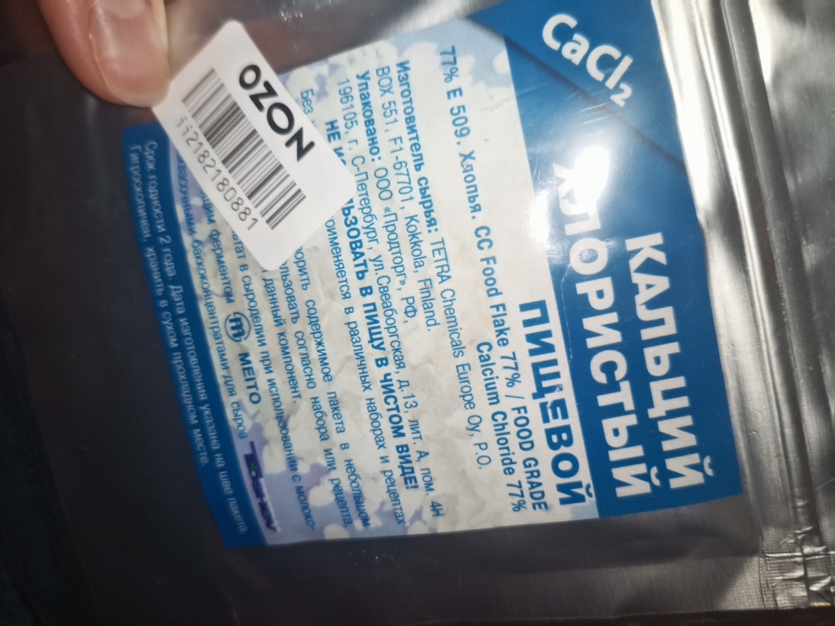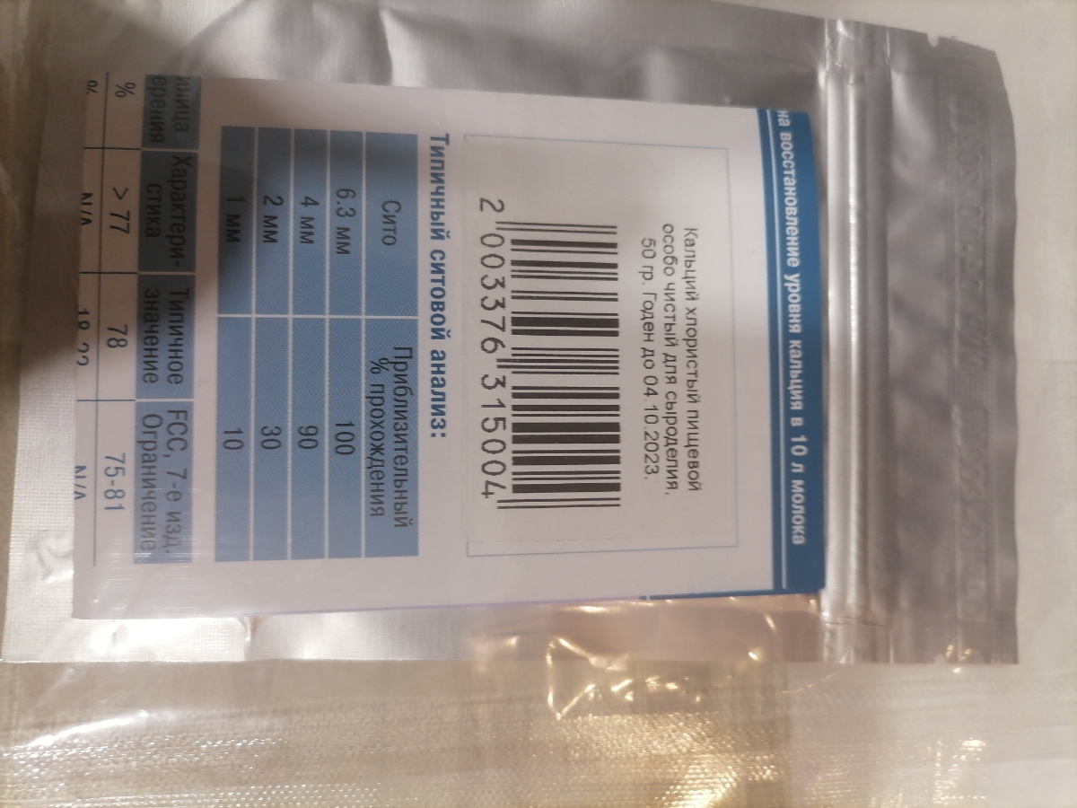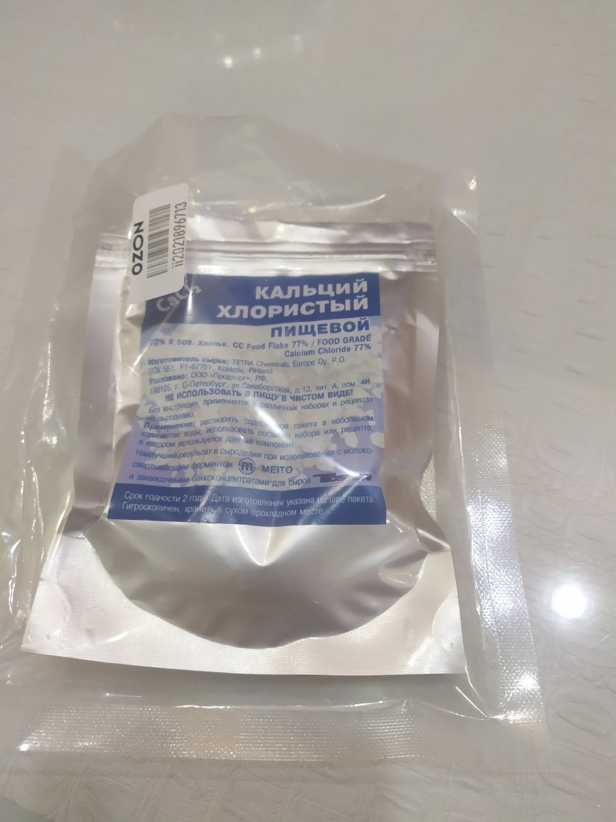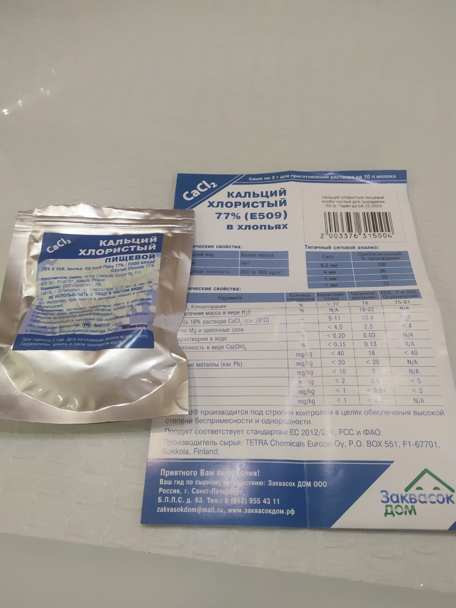 Условия хранения:В сухом прохладном местеСостав:Хлористый кальций, 77%Описание:Пакет нетто 50 грамм! В производстве сыра хлорид кальция компенсирует низкий уровень содержания кальция в молоке после процесса пастеризации, так как часть солей кальция при те