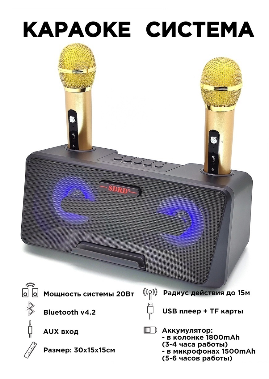 Комплектация:Кабель USB/microUSBКараоке система на два микрофона SDRD SD-301Аудио кабель AUXДва микрофонаИнструкцияОписание:Караоке система SDRD SD-301 обладает интересным дизайном с неоново-синей подсветкой динамиков, что поможет создать романтичную или
