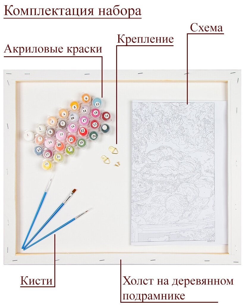 Состав комплектаНабор красок, Раскраска, Холст на подрамнике, Настенное крепление для картины, Кисть (3 шт.)