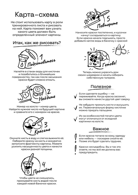 Состав комплектаНабор красок, Кисть, Холст на подрамнике, Контрольный лист, Настенное крепление для картины