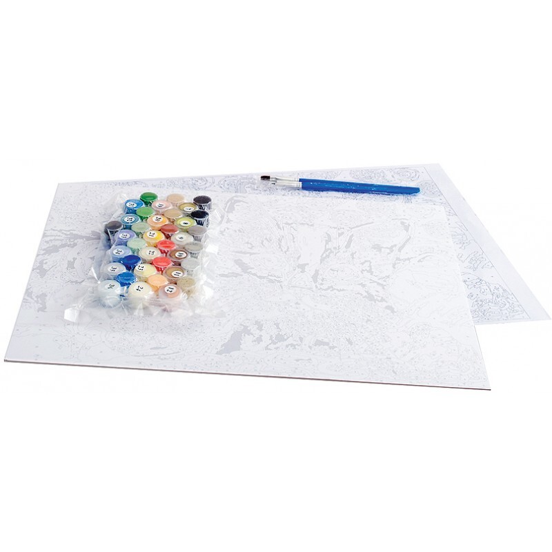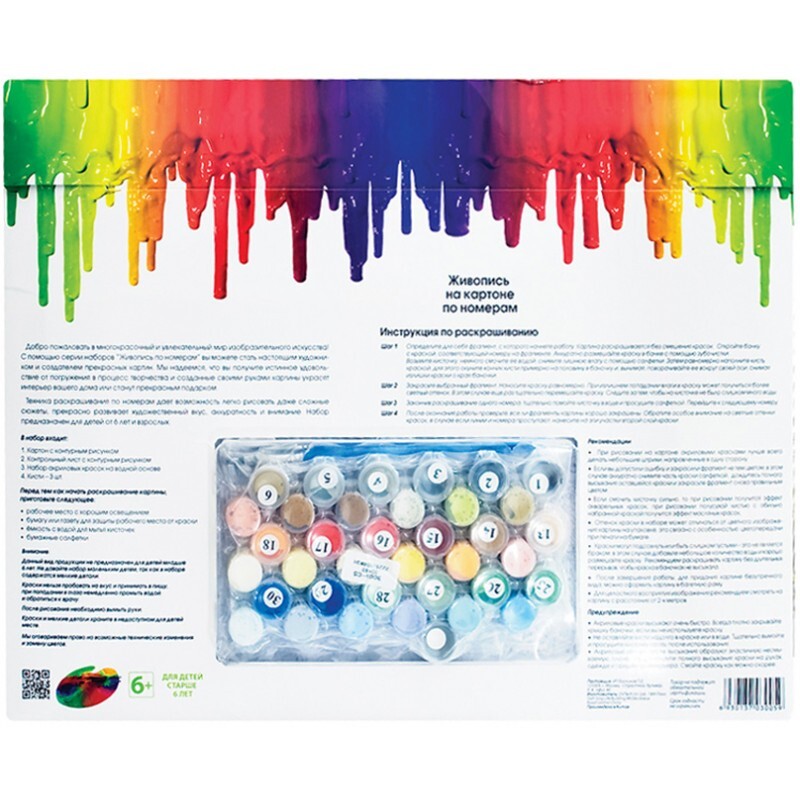 Состав комплектаНабор красок, Контрольный лист, Картонная основа с контурным рисунком, Кисть (4 шт.)
