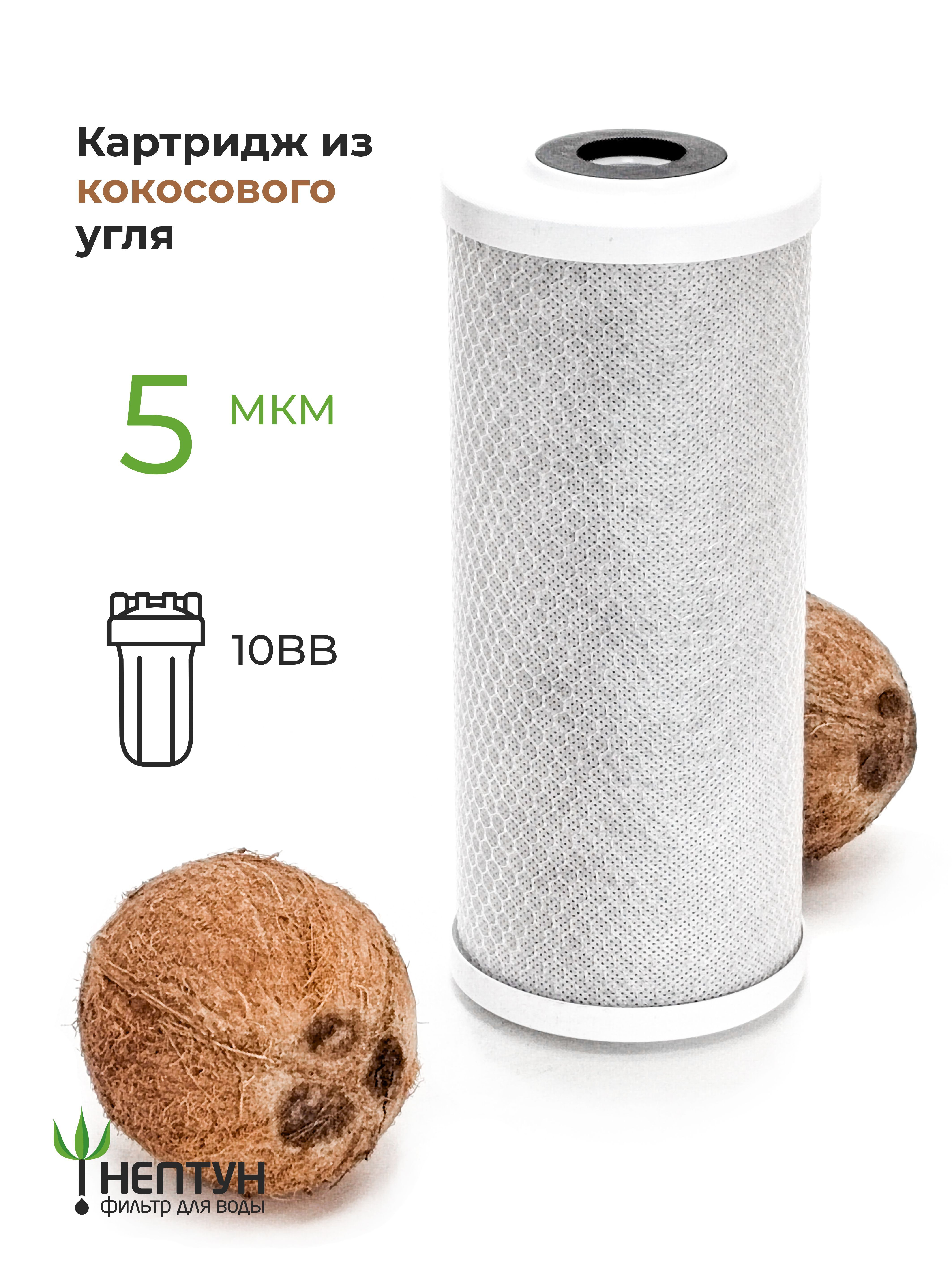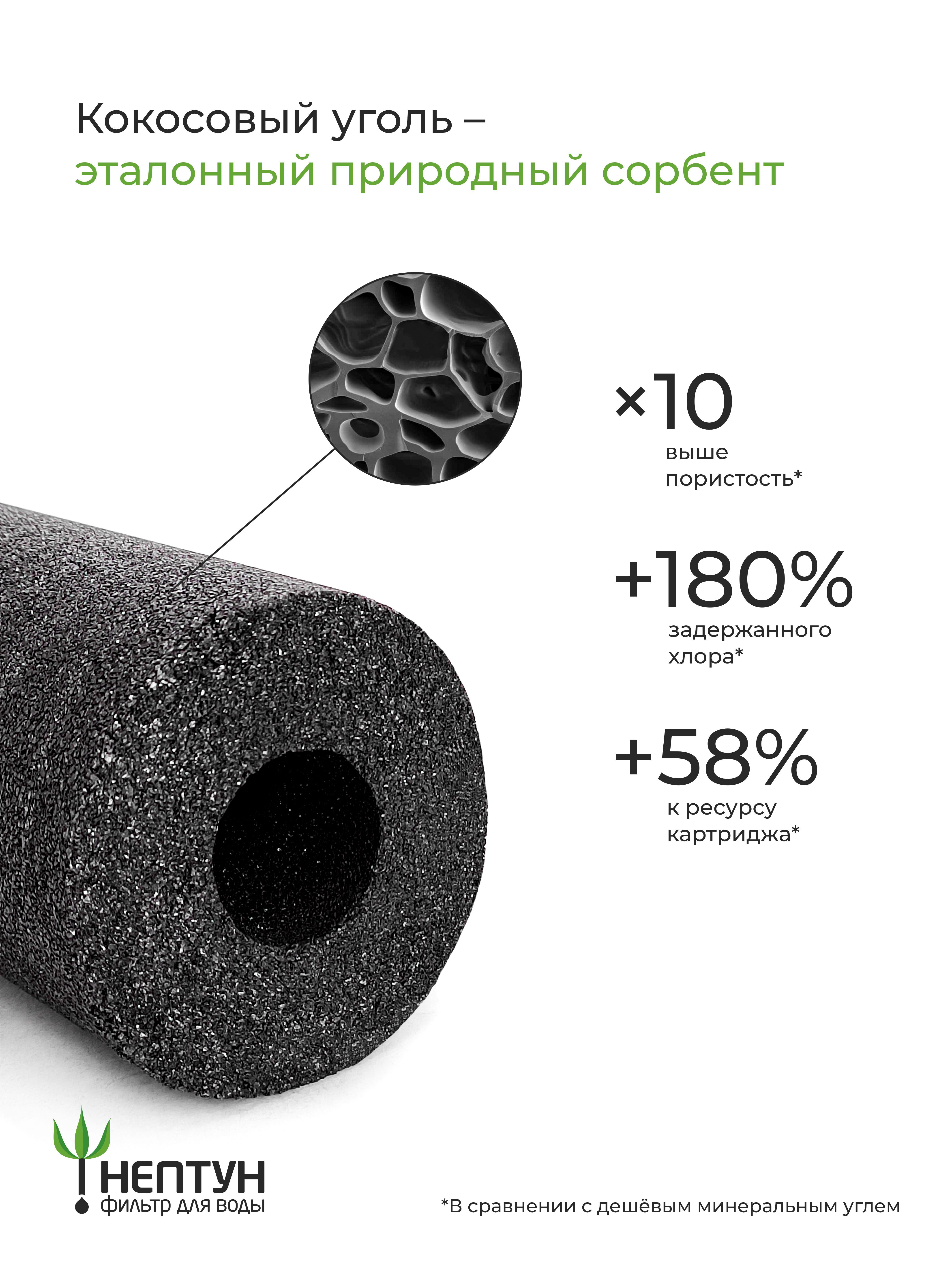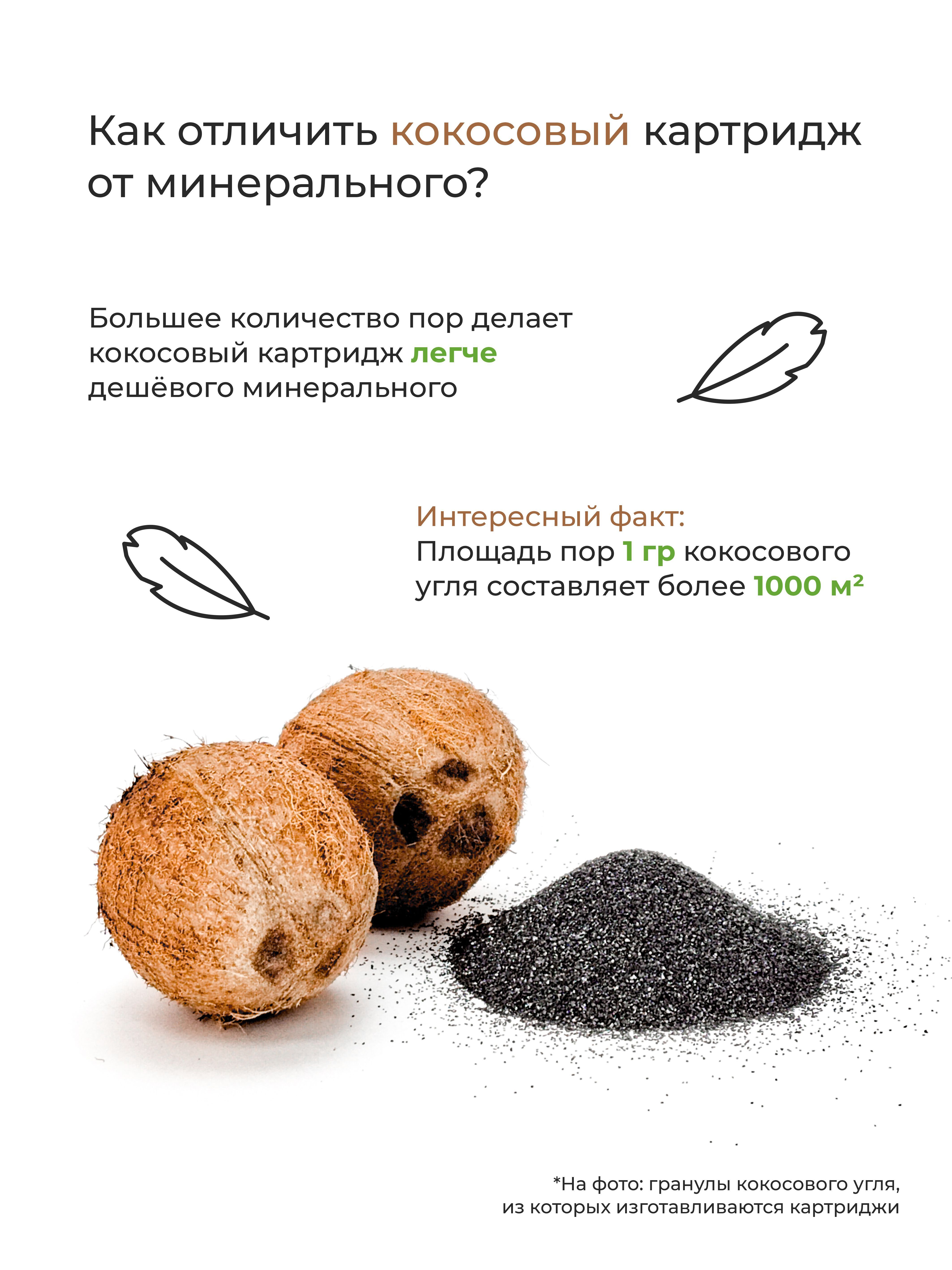 Изготовлен из высококачественного кокосового угля, как следствие наивысшие сорбционная ёмкость и ресурс - в этом отличие данного качества от дешевых аналогов. Очищает воду от свободного хлора, хлорогранических соединений, нефтепродуктов, др. органических