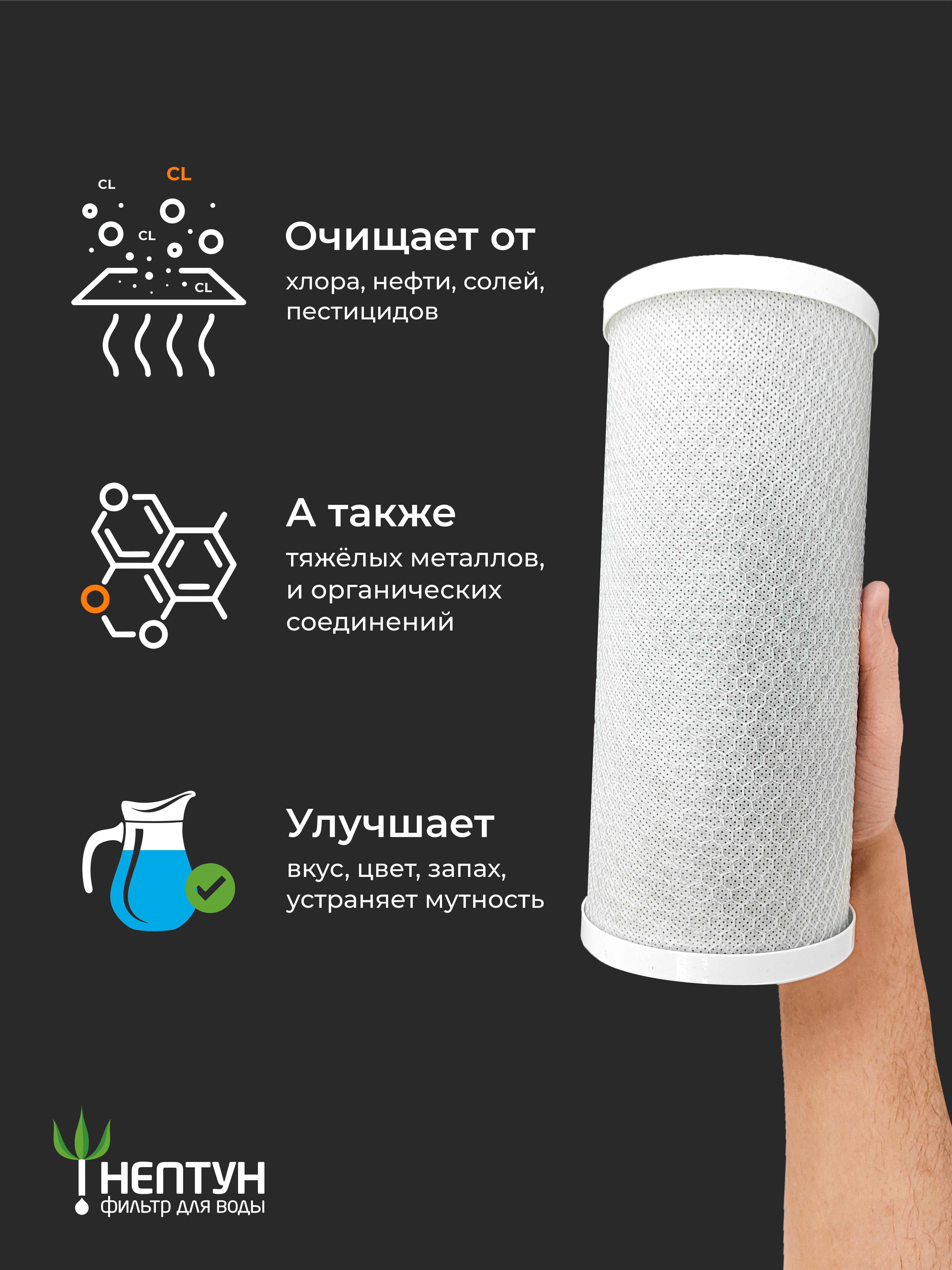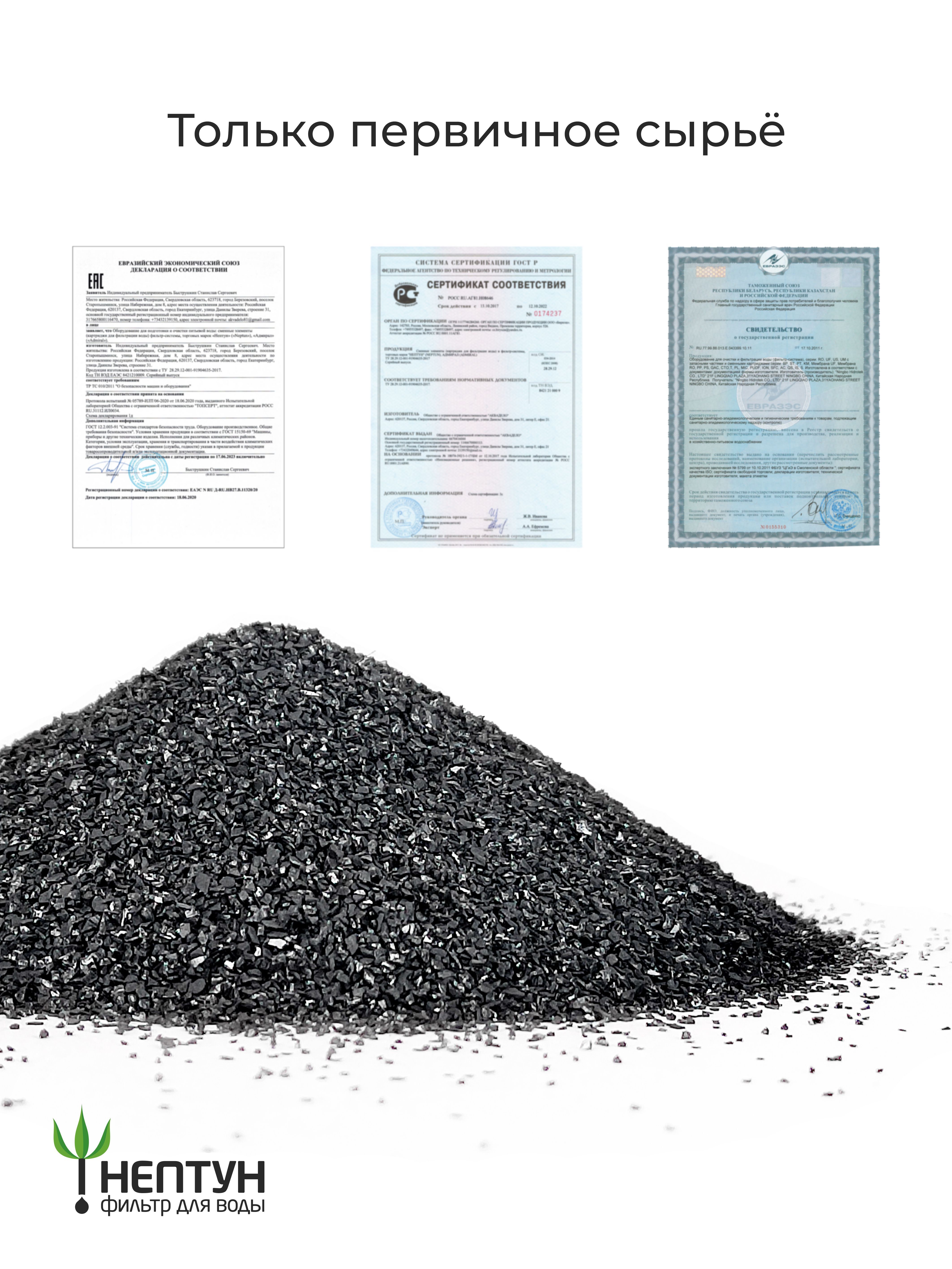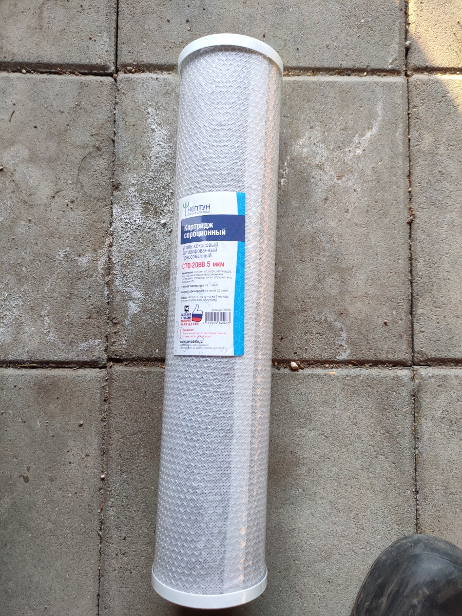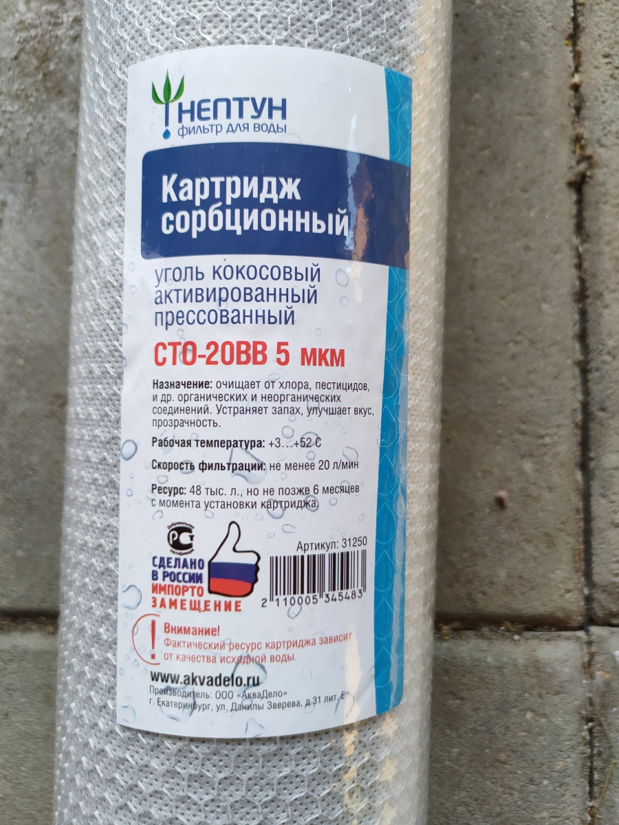 Изготовлен из высококачественного кокосового угля, как следствие наивысшие сорбционная ёмкость и ресурс - в этом отличие данного качества от дешевых аналогов. Очищает воду от свободного хлора, хлорогранических соединений, нефтепродуктов, др. органических