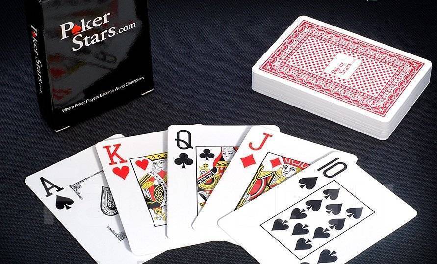 Пластиковые игральные карты известной серии Poker Stars, колода 54 штуки. Карты из 100% пластика, тактильно приятные с гладкой стороной рубашки и фактурной лицевой стороной для лучшего сцепления с пальцами игрока и перемещения по сукну игрового поля. Отли