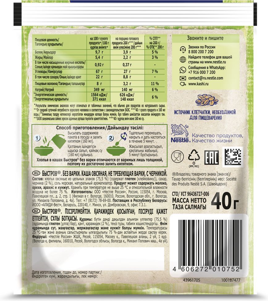 Условия хранения:0-25Состав:Хлопья овсяные из цельных злаков (75,5%) (содержат глютен (клейковину)), сахар, черника (2%), соль морская, натуральный ароматизатор. Продукт может содержать орехи и молоко.Описание:Каждый день может быть обычным, а может быть