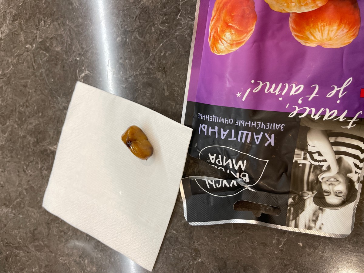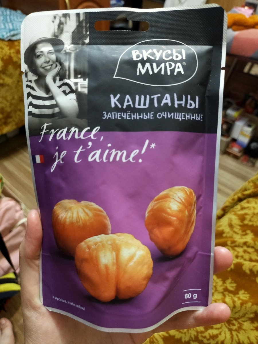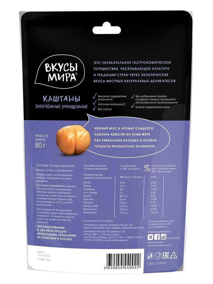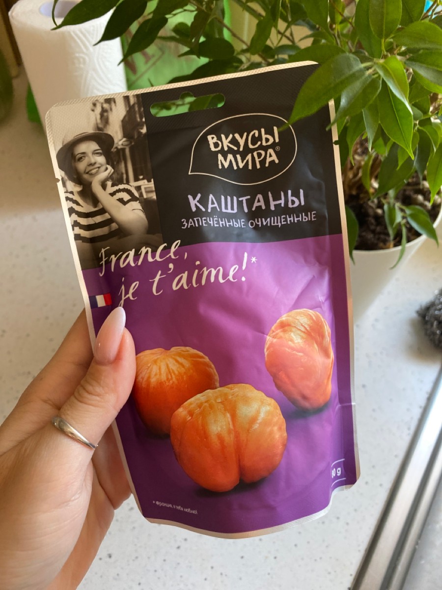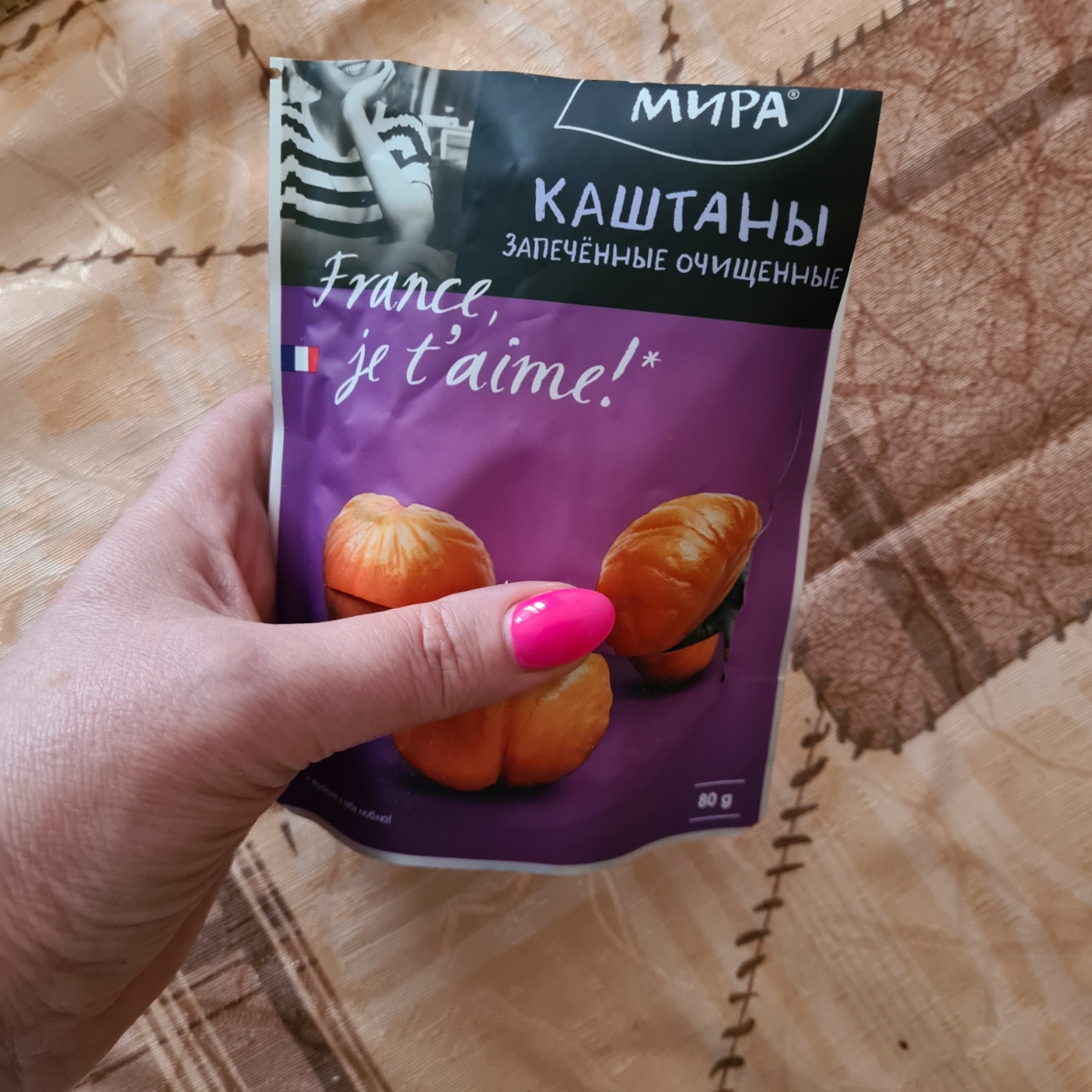 Условия хранения:После вскрытия упаковки продукт хранить при температуре от +2° С до +8°С не более 48 часов.Состав:Каштаны