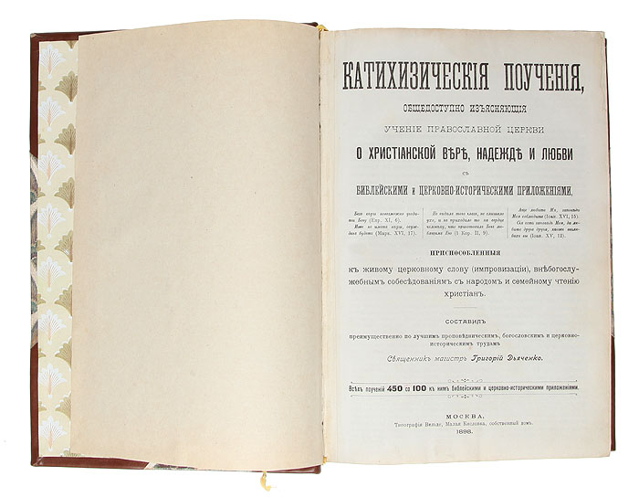 Москва, 1898 год. Типография Вильде. Профессиональный новодельный переплет. Кожаный корешок и уголки. Золотое тиснение на корешке. Сохранность хорошая. Из предисловия составителя книги - известного духовного писателя, катехизатора и публициста протоиер
