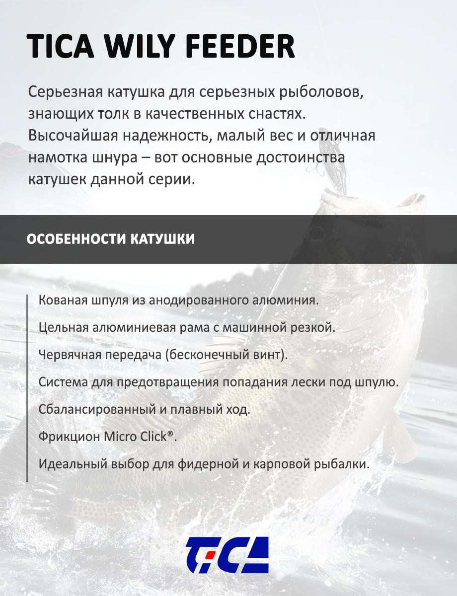 Катушка Tica Wily Feeder – это настоящий подарок для любителей карповой и фидерной ловли. Серьезная катушка для серьезных рыболовов, знающих толк в качественных снастях. Высочайшая надежность, способность выдерживать колоссальные нагрузки и отличная намот