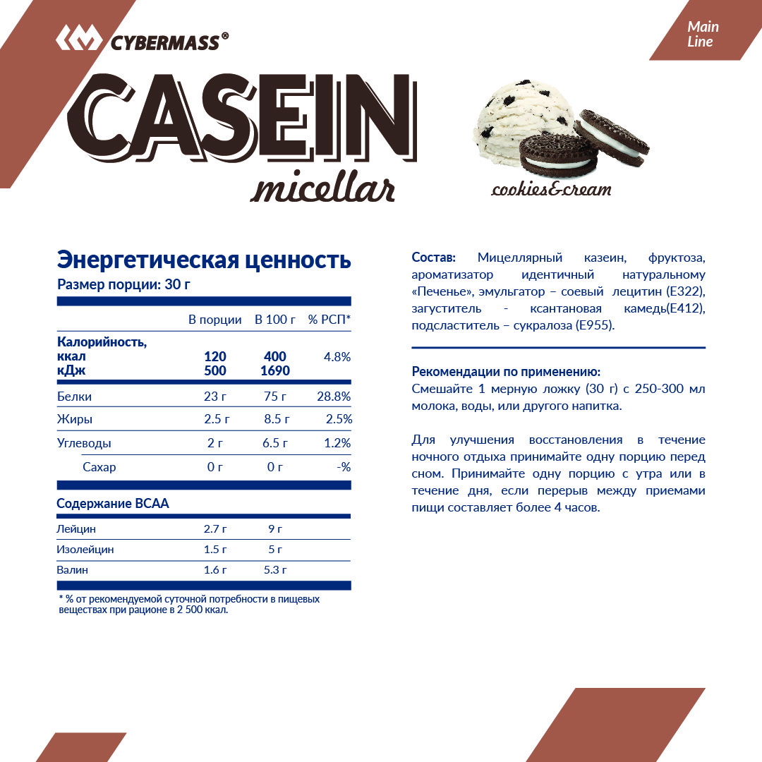MICELLAR CASEIN – сложносоставной белок, являющийся результатом ферментного створаживания молока. Casein от Cybermass позволяет Вам значительно улучшить восстановление Ваших мышц после физических нагрузок! Мицеллярный казеин, благодаря своей структуре, ус