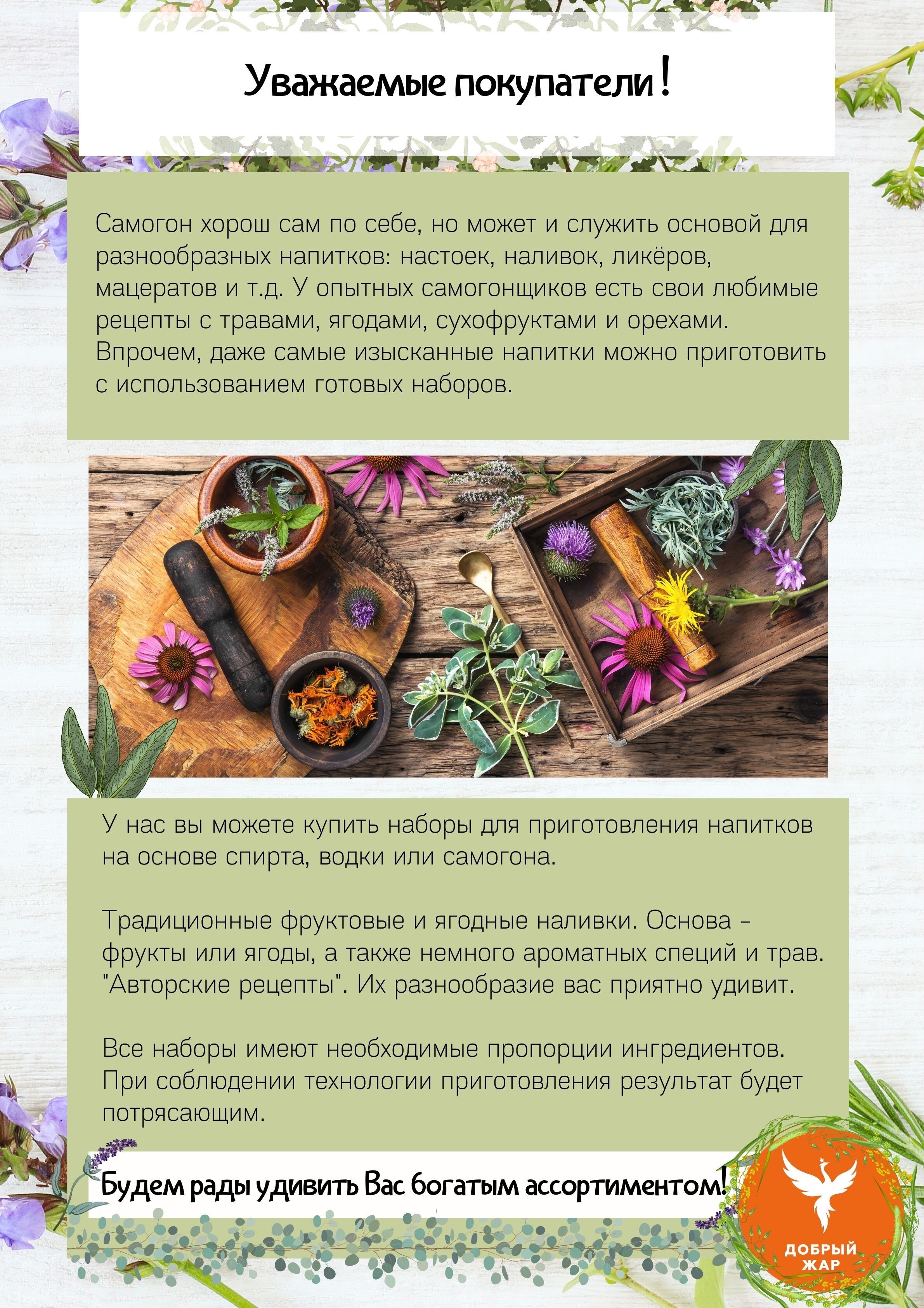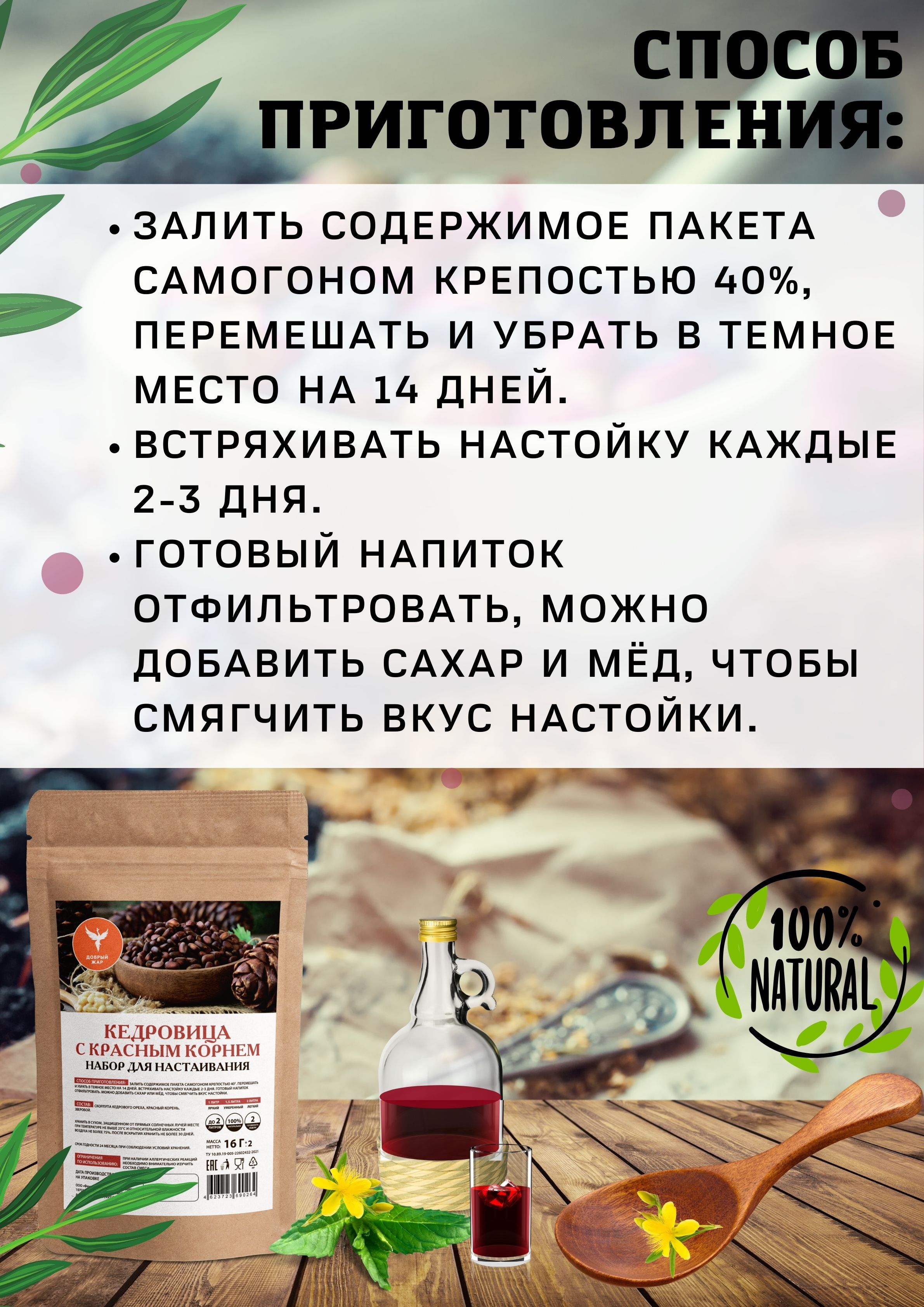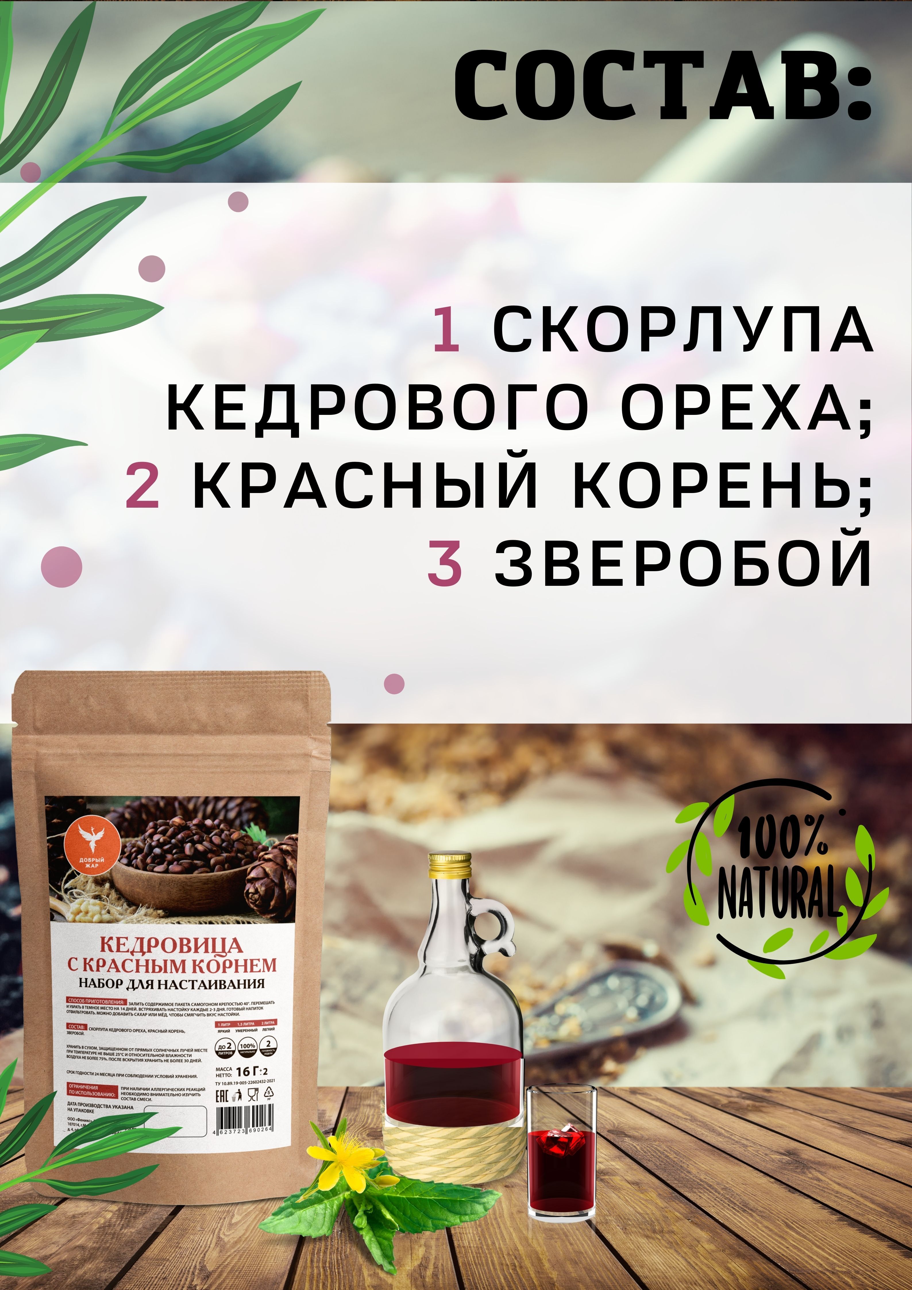 Состав:скорлупа кедрового орехакрасный кореньзверобойУсловия хранения:Хранить в сухом, защищенном от прямых солнечных лучей, месте при температуре не выше 25С и относительной влажности воздуха не более 75%.Комплектация:Настойка для самогона Кедровица с к