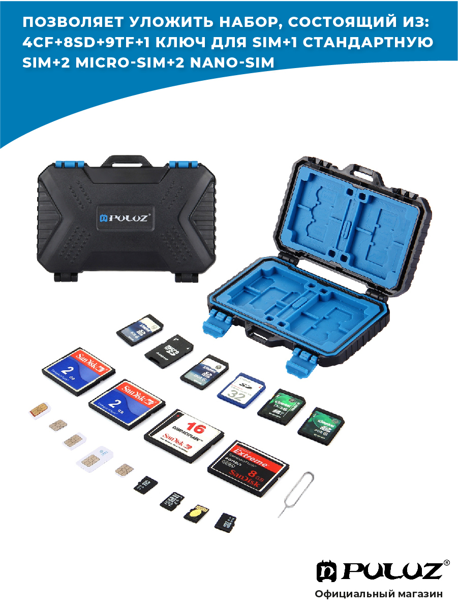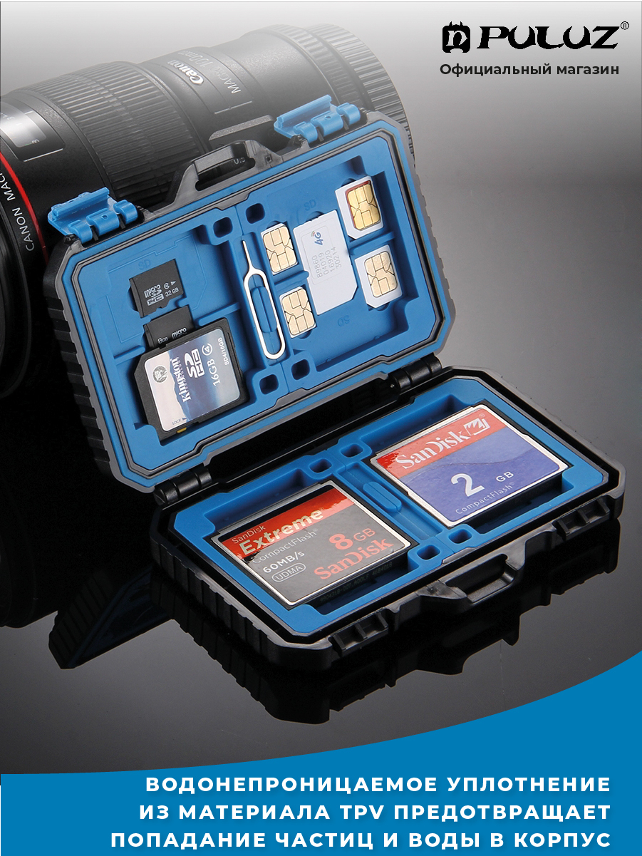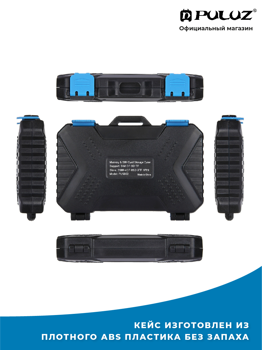 Особенности:Прочный ABS пластикУплотнитель для защиты от падений, брызг, пыли, грязиЛегкий (предельно легкий вес изделия не в ущерб прочности)Функциональный и вместительныйИдеален для путешествий или хранения.Кейс вмещает: 4CF + 8SD + 9TF + 1 PIN-код карт