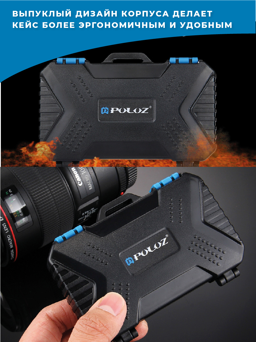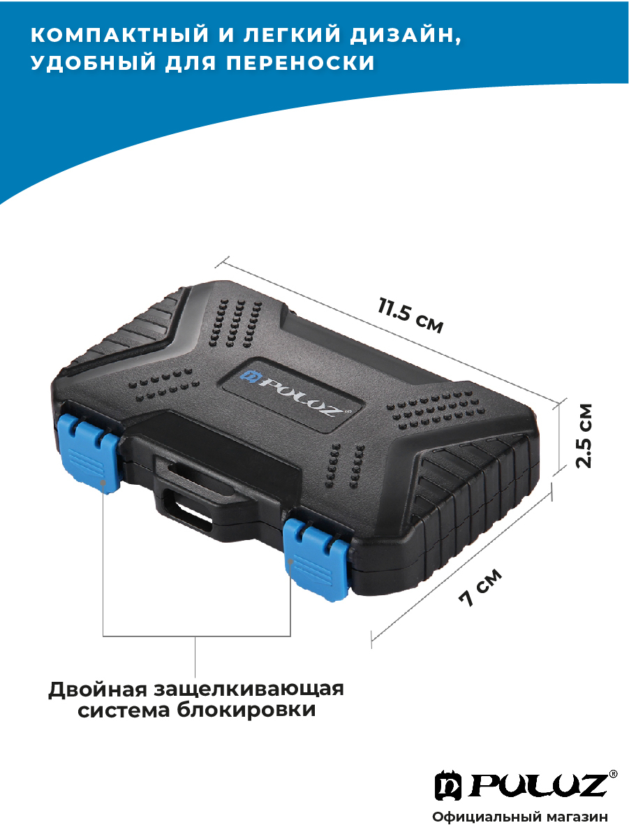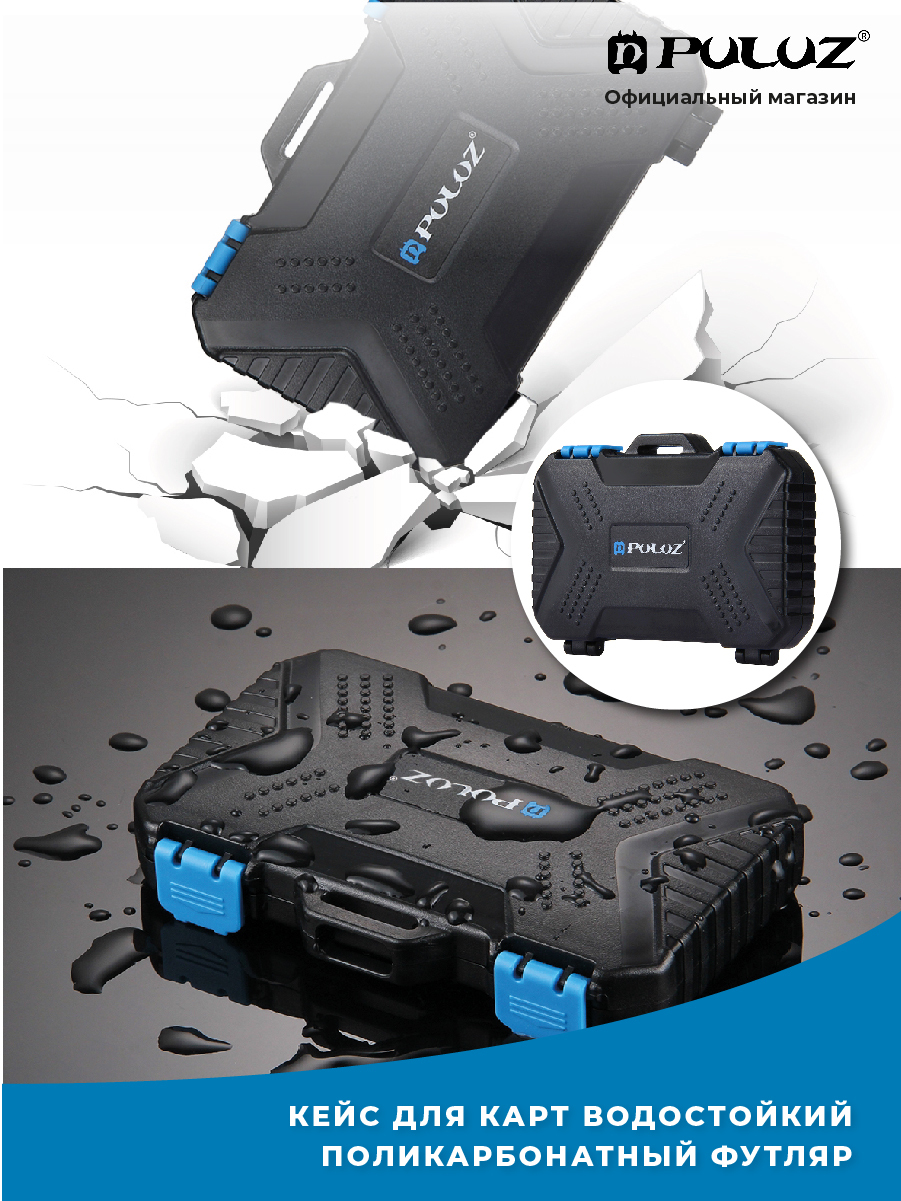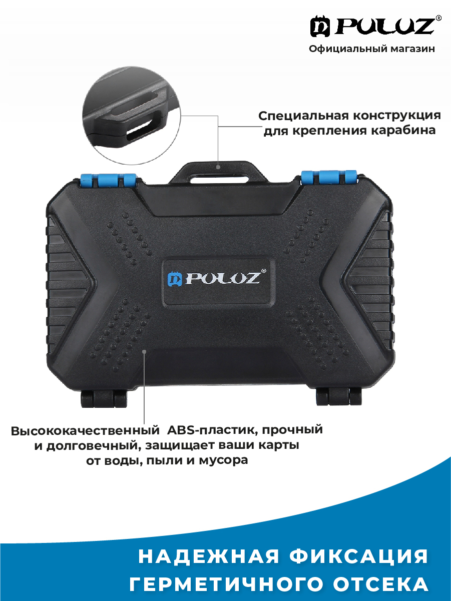 Особенности:Прочный ABS пластикУплотнитель для защиты от падений, брызг, пыли, грязиЛегкий (предельно легкий вес изделия не в ущерб прочности)Функциональный и вместительныйИдеален для путешествий или хранения.Кейс вмещает: 4CF + 8SD + 9TF + 1 PIN-код карт