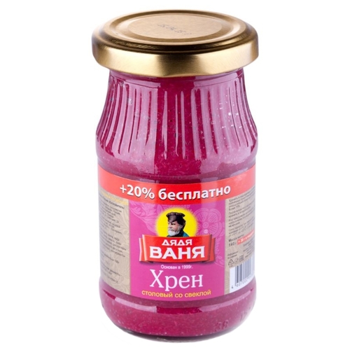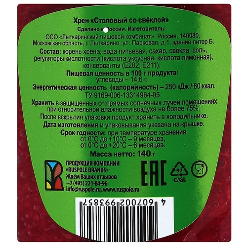Составкорень хрена, вода питьевая, сахар, свекла, соль, регуляторы кислотности (кислота уксусная, кислота лимонная), консерванты ( Е202, Е211)