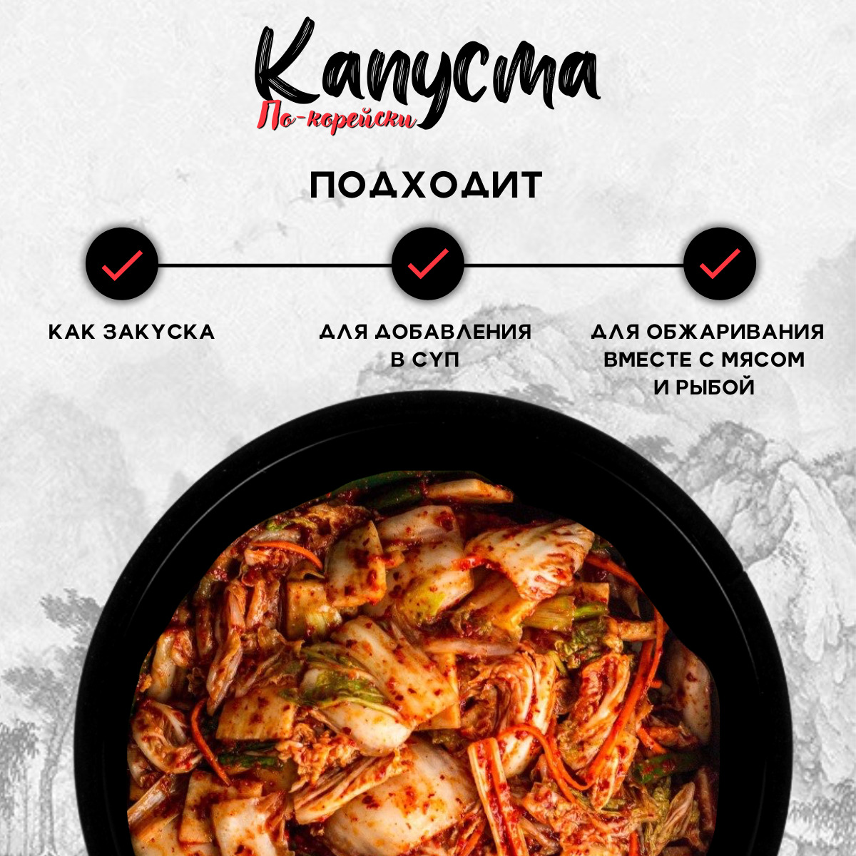 Условия хранения:Хранить при температуре от 0 до 25 и относительной влажности воздуха не выше 75%. После вскрытия упаковки хранить в холодильнике не более 48 часов.Состав:Пекинская капуста, перец кайенский, перец кочукару, зеленый лук, репчатый лук, китай