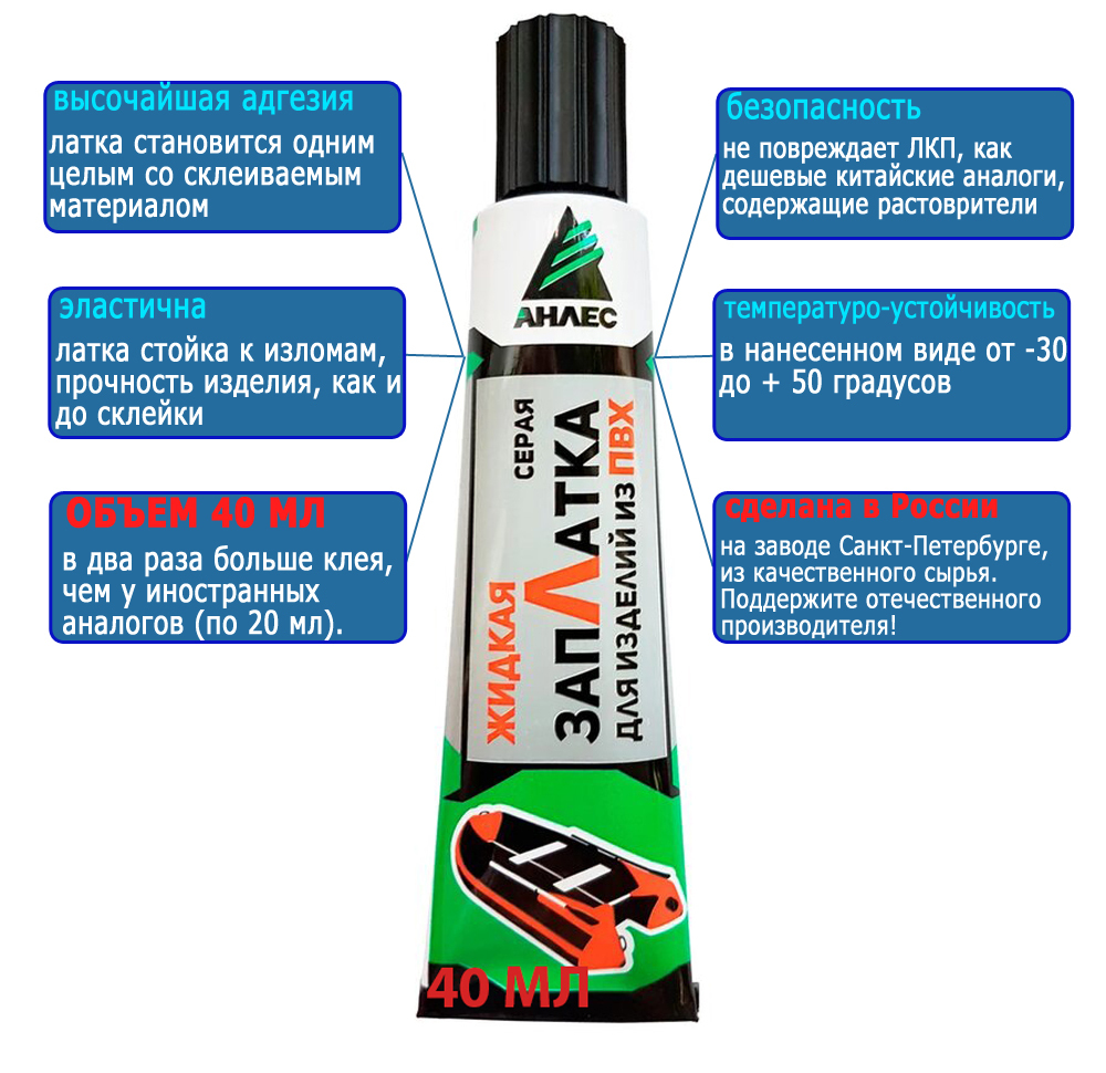 Клей жидкая латка. Объем 40 МЛ.Клей незаменим для ремонта надувных лодок ПВХ и матрасов, бассейнов, сапог, тентов , камер велосипеда и других изделий их ПВХ. Клей для ватрушек, тюбинга. Также используется как клей для гидрокостюмов из неопрена, клей для в