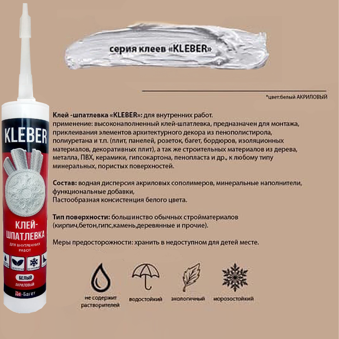Комплектация:клей-шпатлевка 290 мл 1 картриджОписание:Строительный клей-шпатлевка KLEBER – российское производство по немецким технологиям! Применяется для приклеивания тонких потолочных и стеновых плиток и панелей, а также для любых видов декоративных из