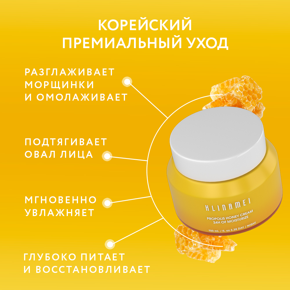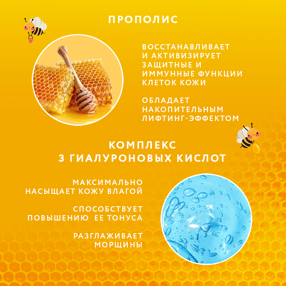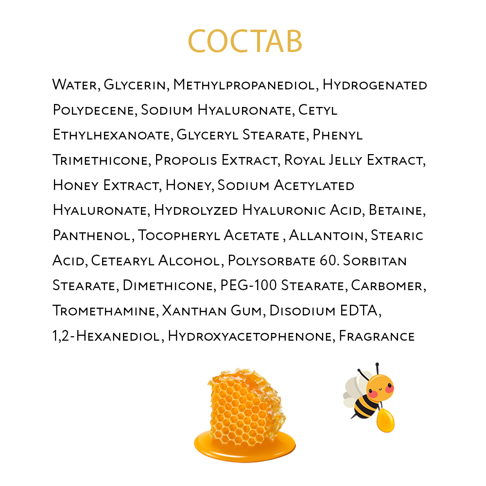 Состав:Water, Glycerin, Methylpropanediol, Hydrogenated Polydecene, Sodium Hyaluronate, Cetyl Ethylhexanoate, Glyceryl Stearate, Phenyl Trimethicone, Propolis Extract, Royal Jelly Extract, Honey Extract, Honey, Sodium Acetylated Hyaluronate, Hydrolyzed Hy