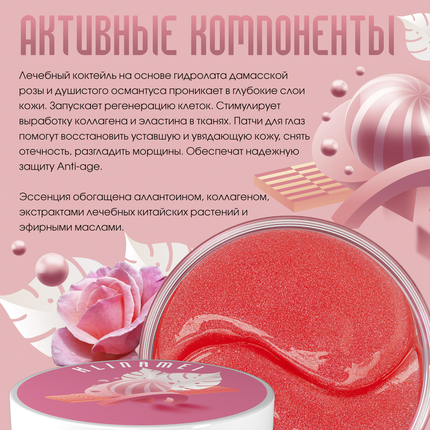 Состав средства:Вода, глицерин, каррагинан, глюкоманнан, ксантановая камедь, агар, хлорид кальция, хлорид калия, лимонная кислота, цитрат калия, слюда, CI 12490, вода из цветов турецкой розы, экстракт цветов османтуса, экстракт гамамелиса, эритритол, проп