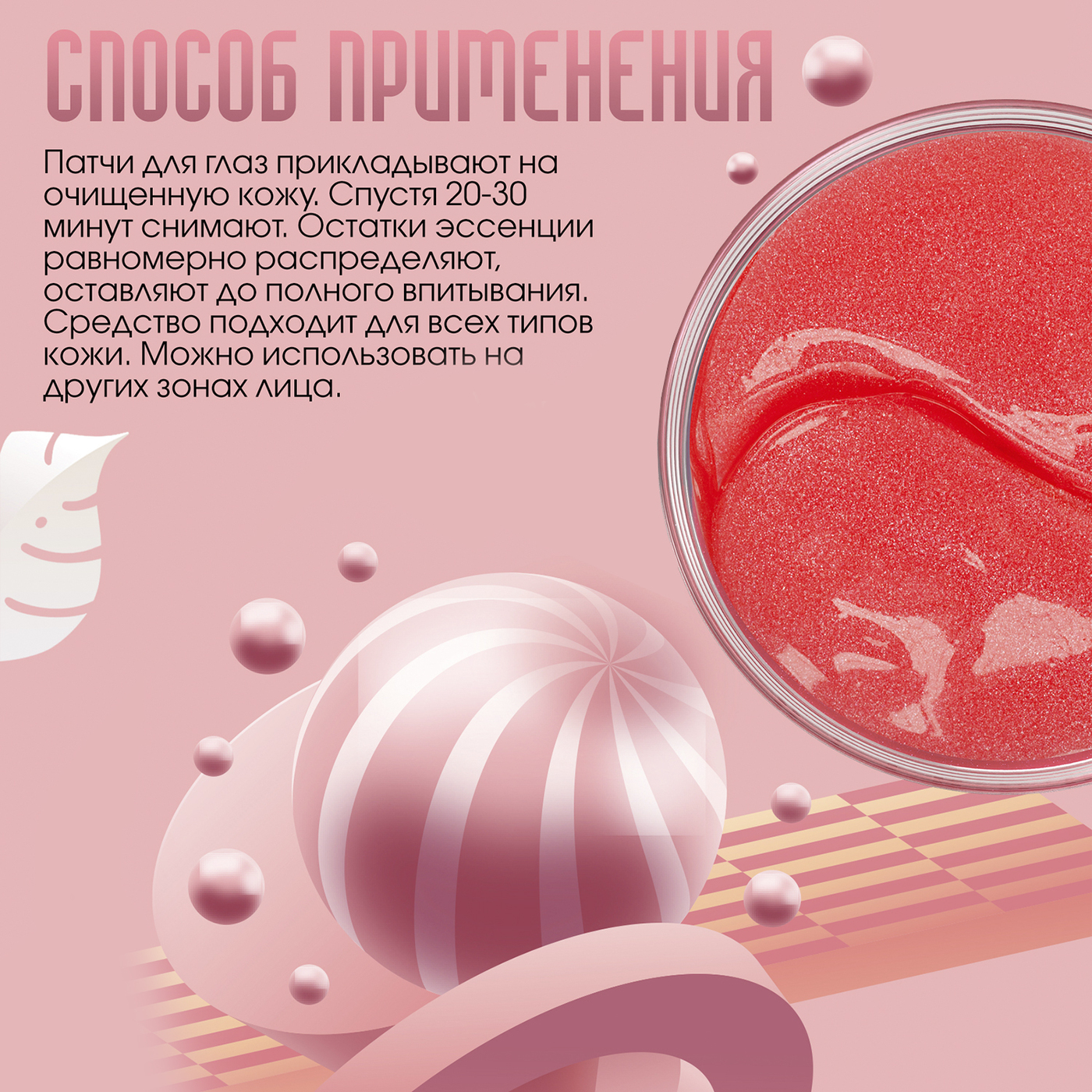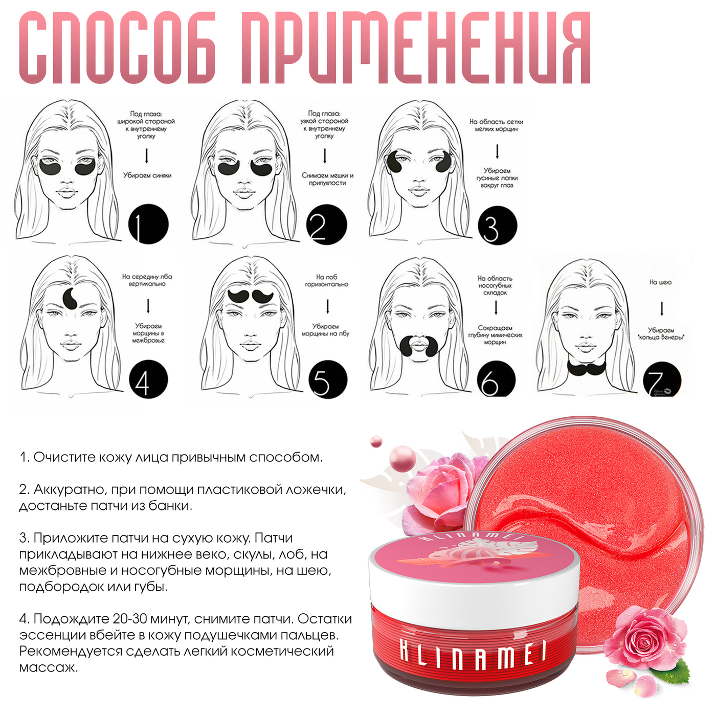 Способ примененияПатчи для глаз прикладывают на очищенную кожу. Спустя 20-30 минут снимают. Остатки эссенции равномерно распределяют, оставляют до полного впитывания. Для всех типов кожи. Патчи хорошо приклеиваются, не сползают. Можно использовать на других зонах лица.