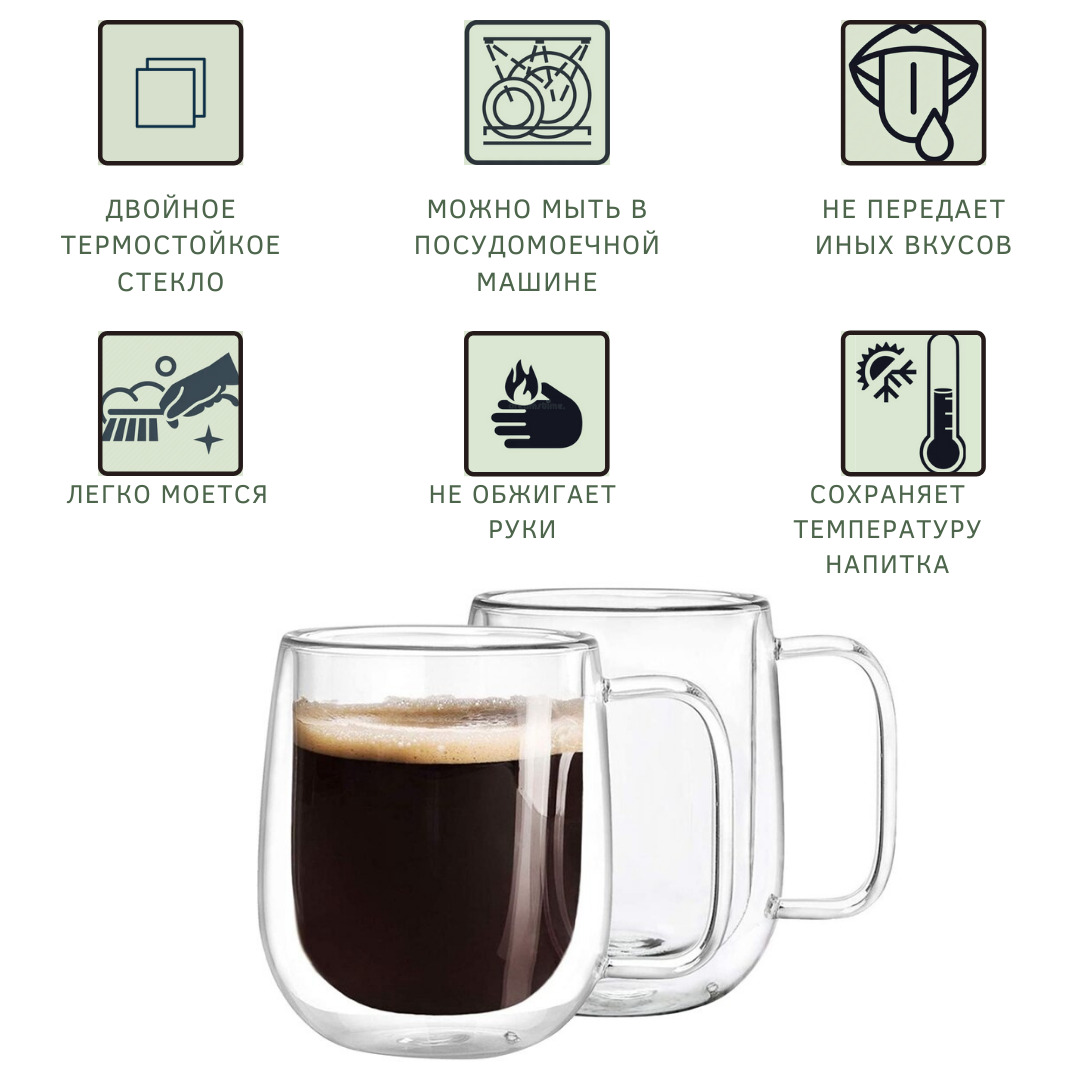 Состав набора:Кружка из боросиликатного стекла 2 шт.Комплектация:Не обжигающая стеклянная кружка с двойными стенками 300 мл, термокружка с двойным дном стеклом для кофе капучино и чая, лимонада холодных и горячих напитков 300 мл(артикул 50131) - 2 шт. наб