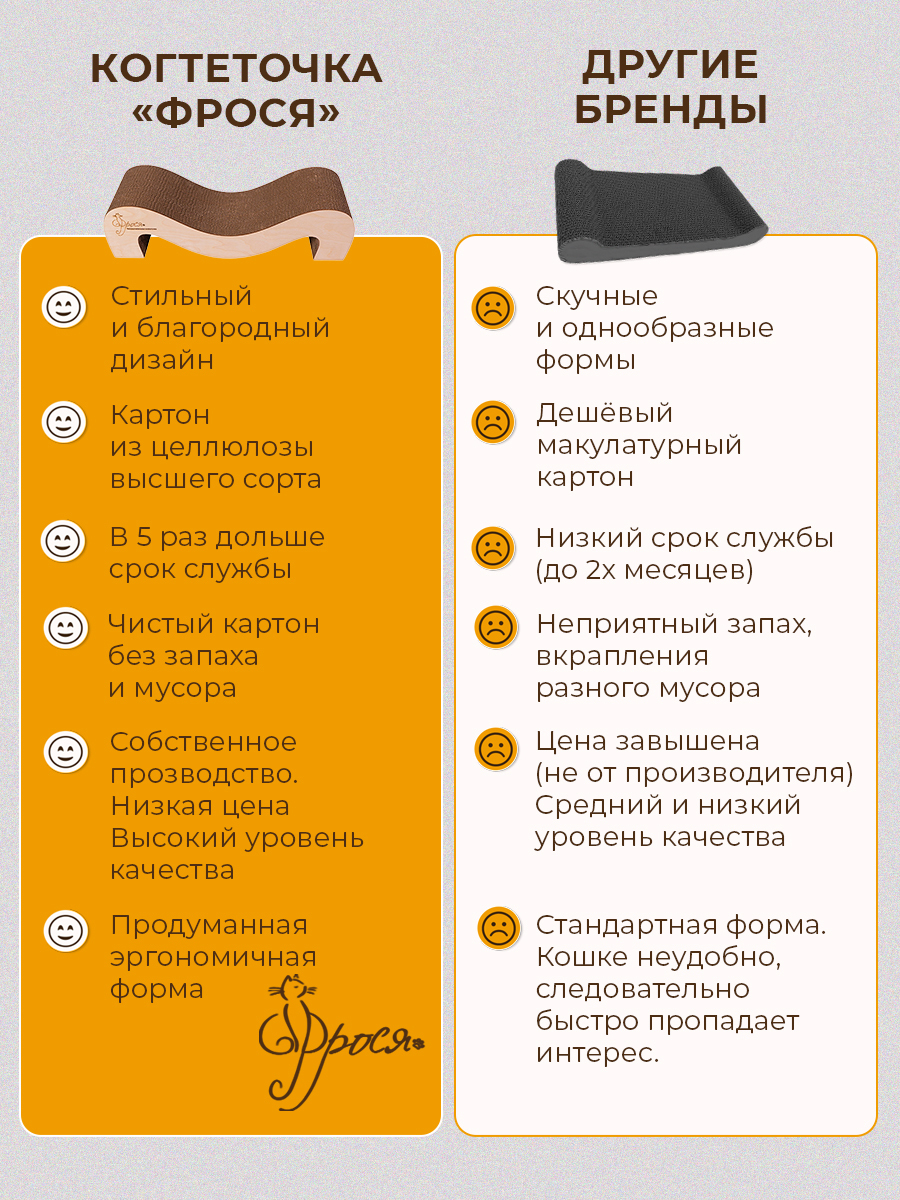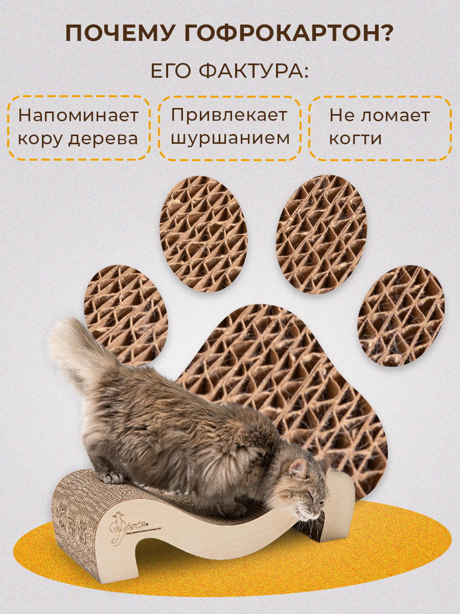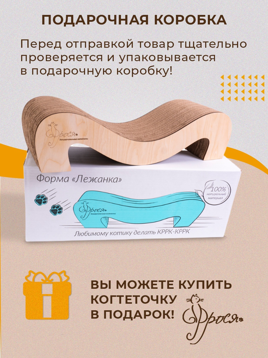Самая удобная и многофункциональная серия когтеточек из гофрокартона - это когтеточки "Фрося".- Картонная когтедралка "Лежанка" очень нравится котятам, кошкам и котам даже без использования мяты!- Лежанка напольная нестандартной формы, отличается от инфин
