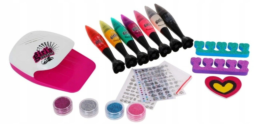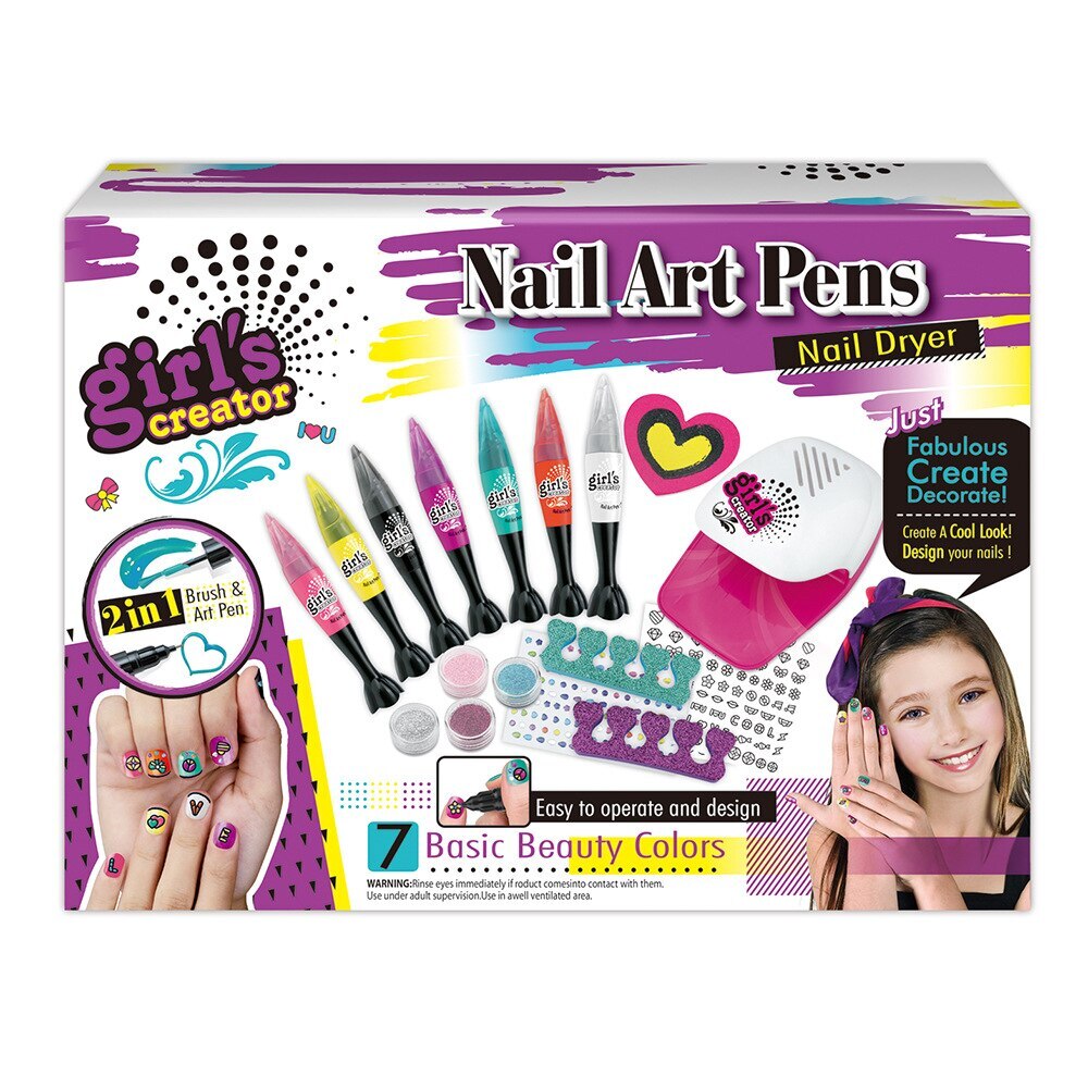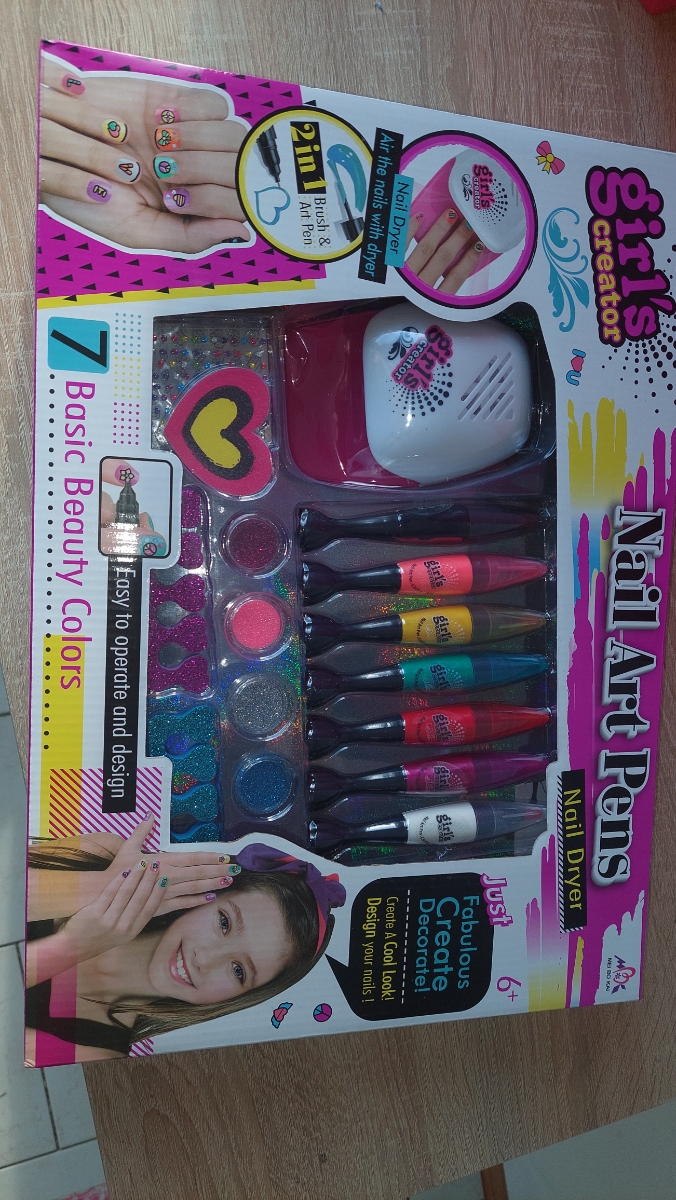 Большой маникюрный набор (Nail Art Pens) - идеальный подарок для девочек от 6 лет. Здесь есть все, что нужно юной моднице: 7 лаков со специальными наконечниками для создания рисунков,4 баночки с блестками,машинка для сушки ногтей с вентилятором,пилоч