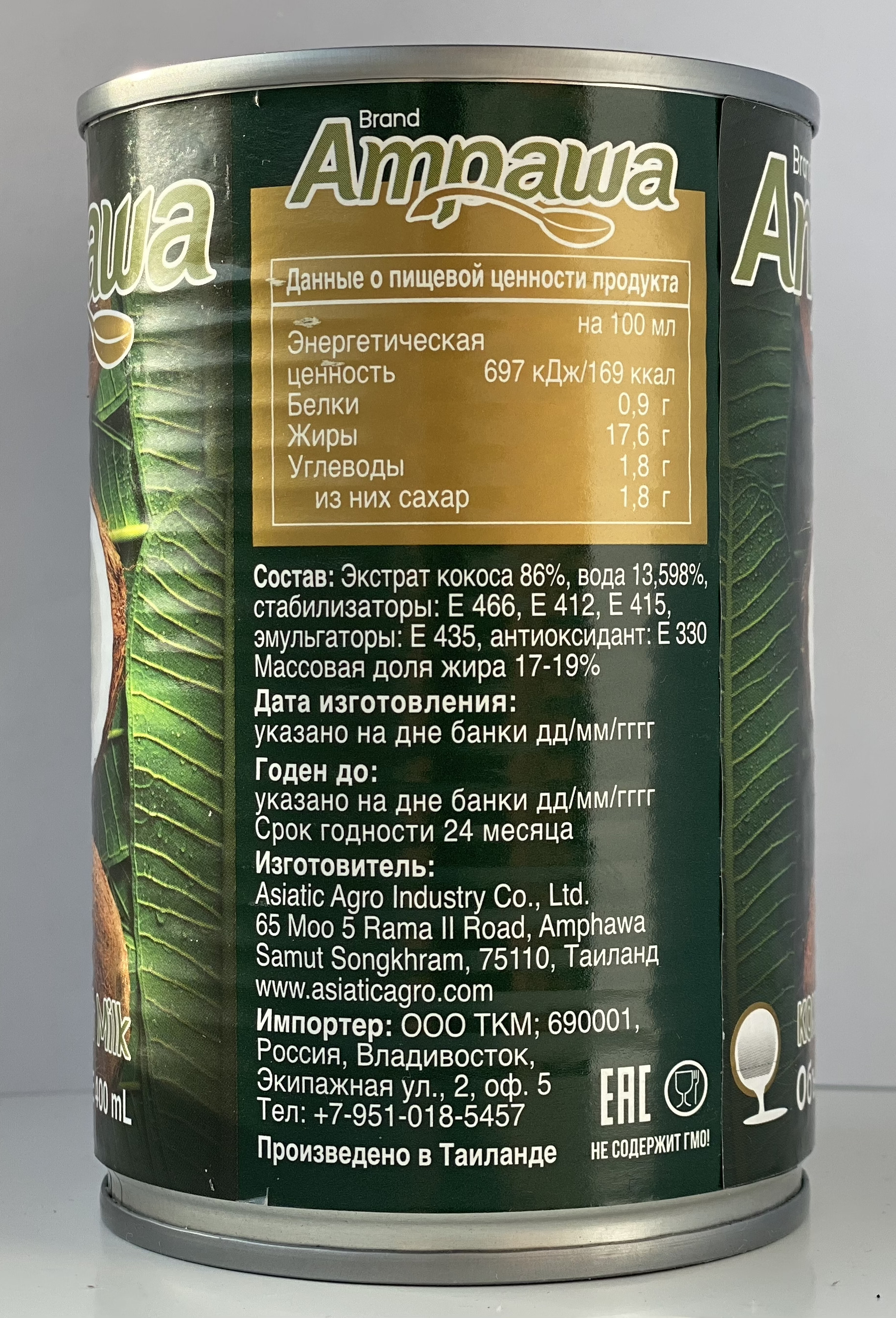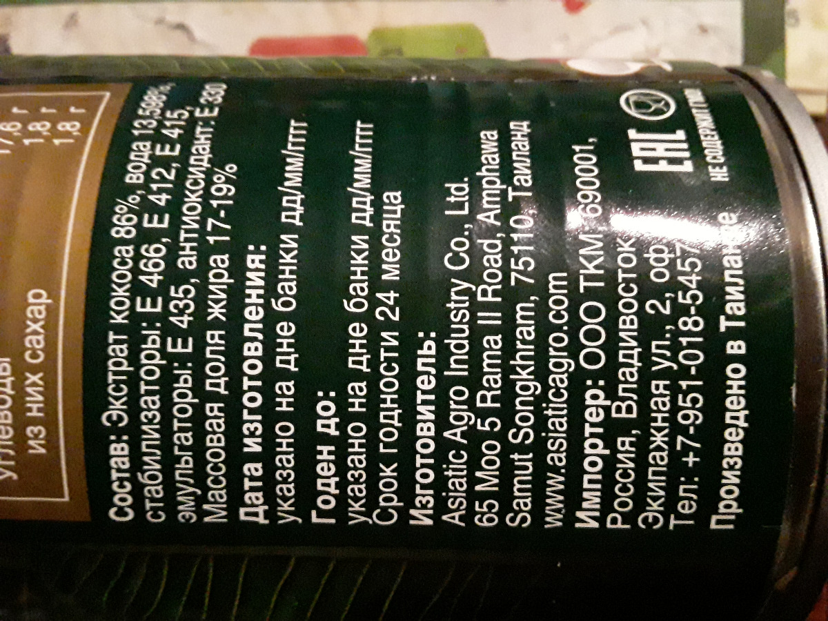 Условия хранения:Условия хранения в сухом, темном месте при температуре не ниже минус 18ºС и не выше 50ºС. При температуре ниже 20ºС кокосовое молоко естественным образом загустевает. При температуре ниже 10ºС или заморозке кокосовое молоко образует хлопь