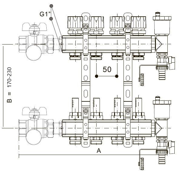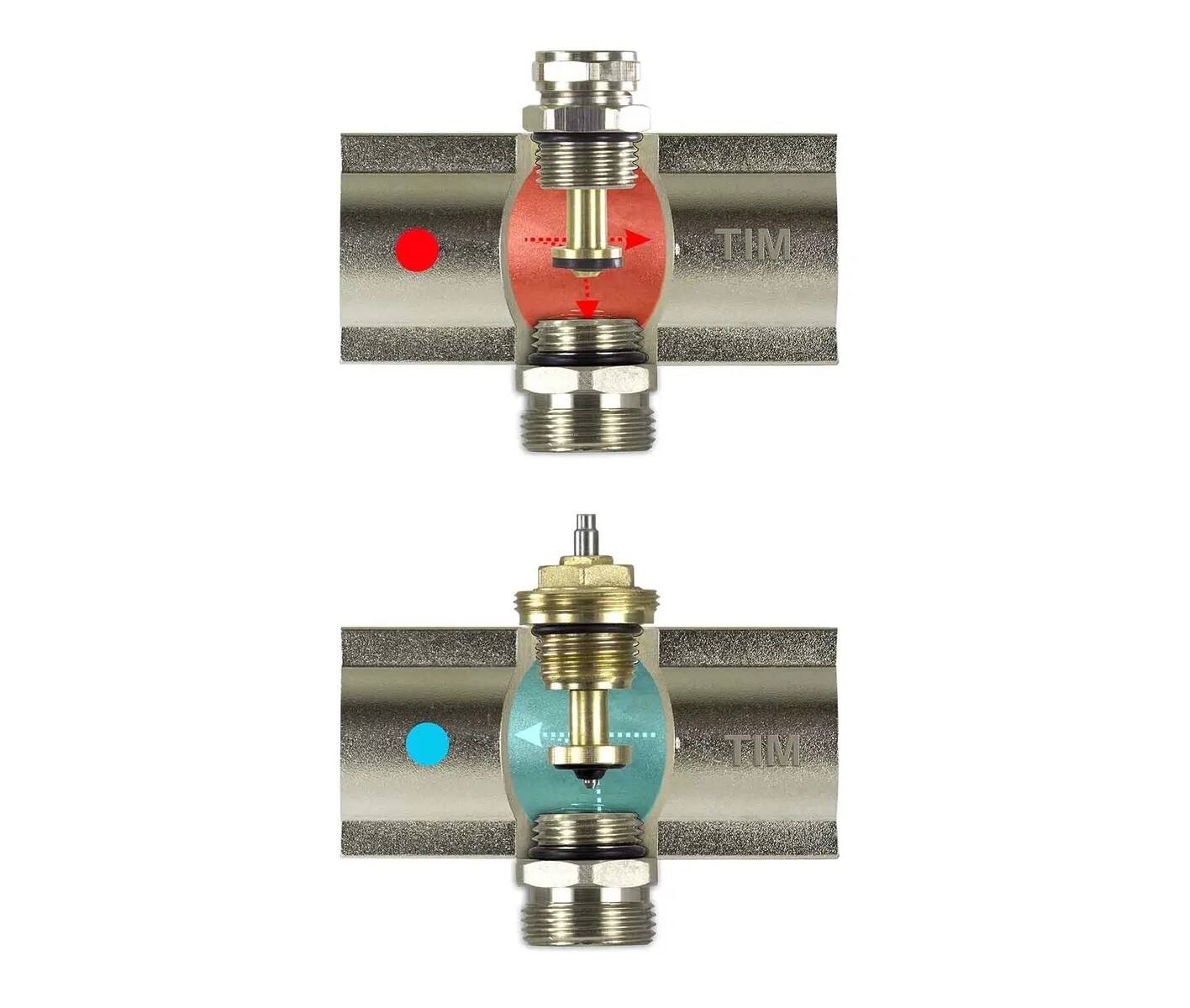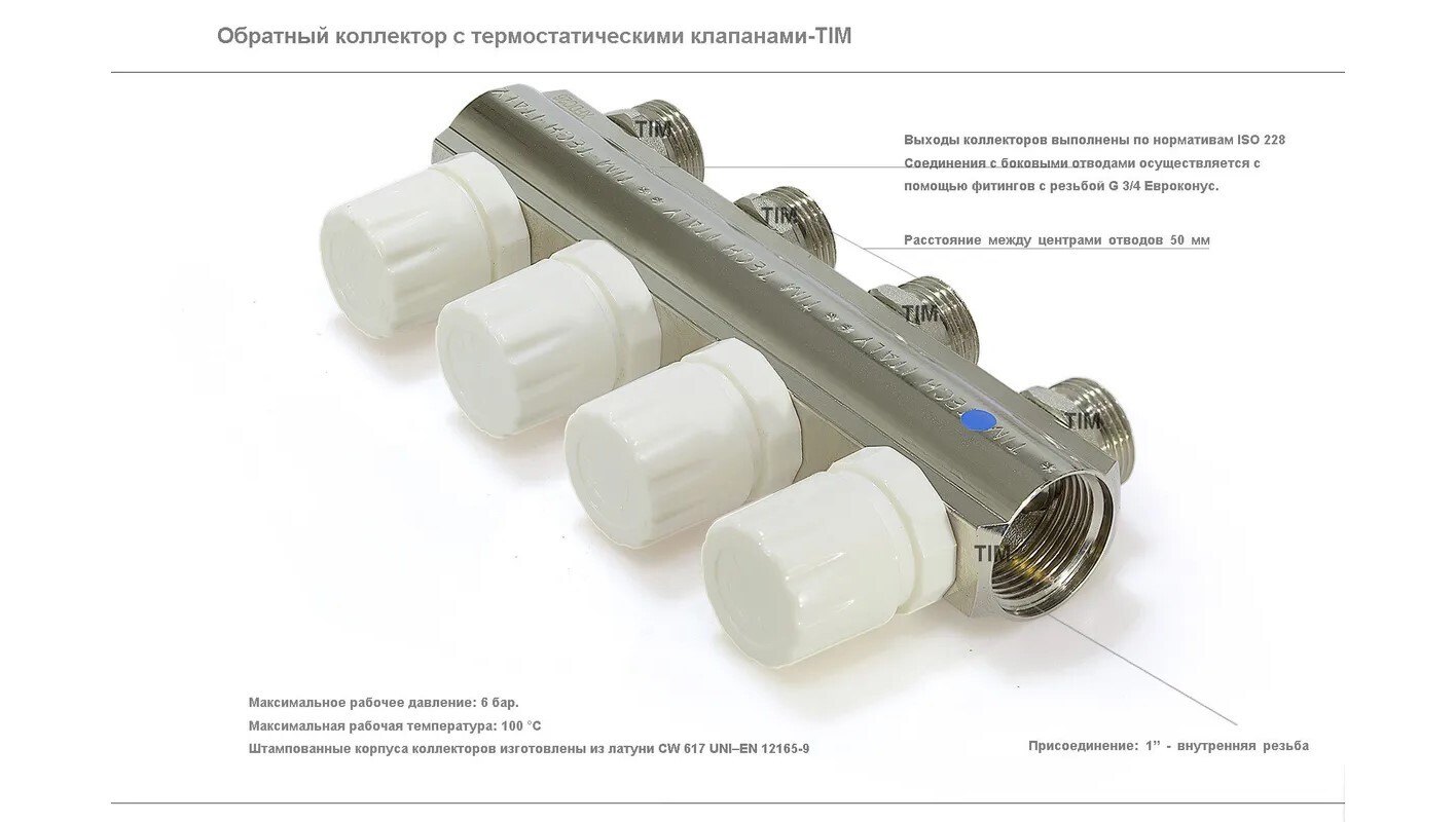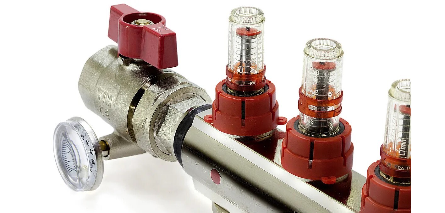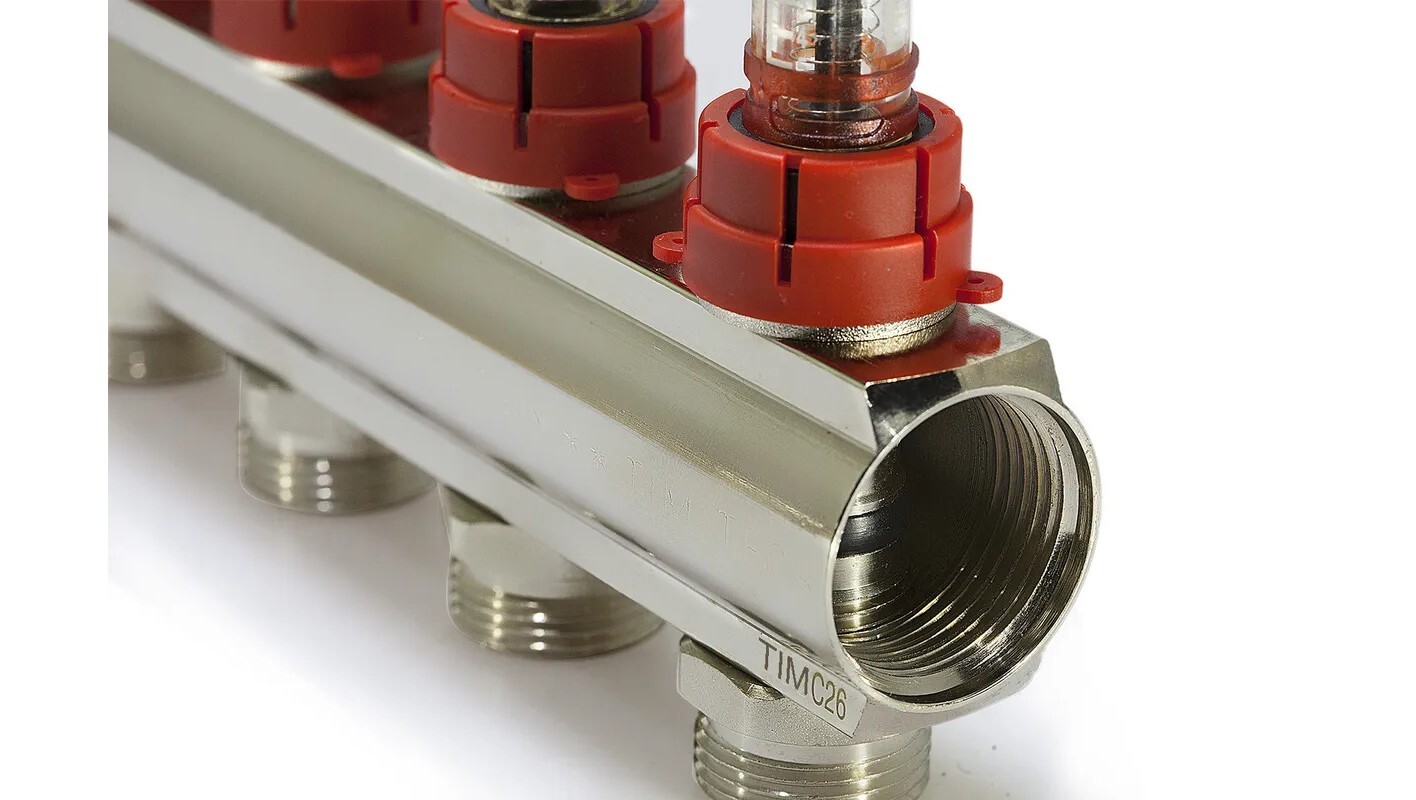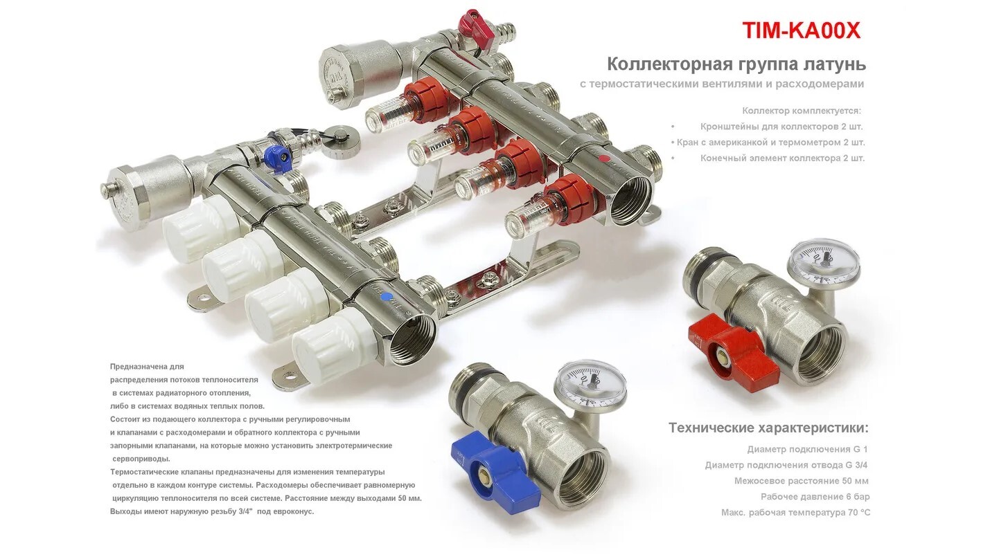 Коллекторная группа TIM 4 выхода с расходомерами предназначается для устройства водяного теплого пола, а также коллекторно-лучевой схеме разводки отопления. Сам коллектор служит для равномерного распределения жидкости на каждый контур. А именно расходомер